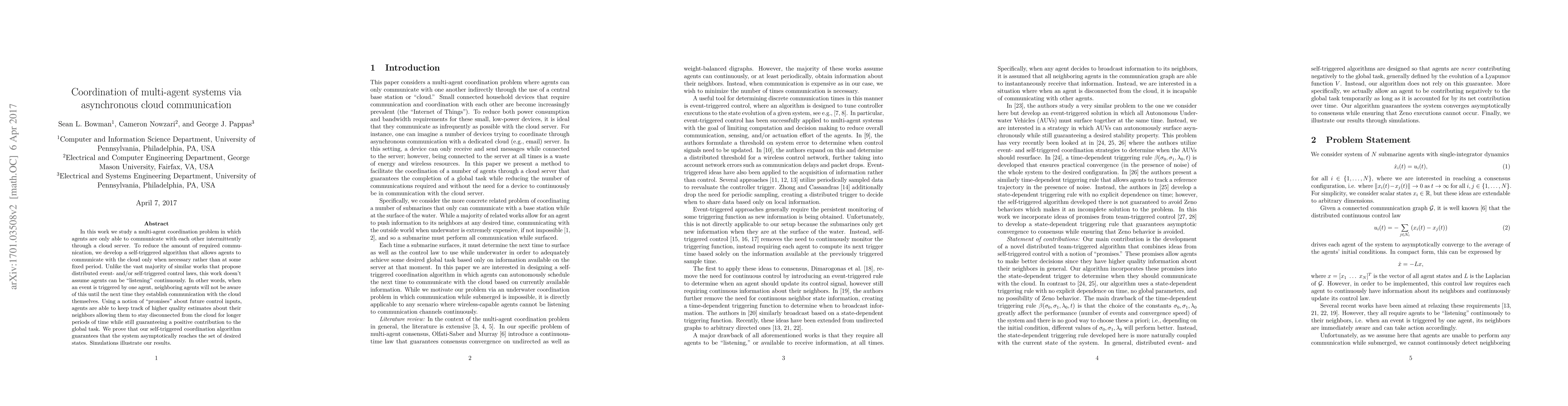 In this work we study a multi-agent coordination problem in which agents are only able to communicate with each other intermittently through a cloud server. To reduce the amount of required communication, we develop a self-triggered algorithm that allows agents to communicate with the cloud only when necessary rather than at some fixed period. Unlike the vast majority of similar works that propose distributed event- and/or self-triggered control laws, this work doesn't assume agents can be "listening" continuously. In other words, when an event is triggered by one agent, neighboring agents will not be aware of this until the next time they establish communication with the cloud themselves. Using a notion of "promises" about future control inputs, agents are able to keep track of higher quality estimates about their neighbors allowing them to stay disconnected from the cloud for longer periods of time while still guaranteeing a positive contribution to the global task. We prove that our self-triggered coordination algorithm guarantees that the system asymptotically reaches the set of desired states. Simulations illustrate our results.