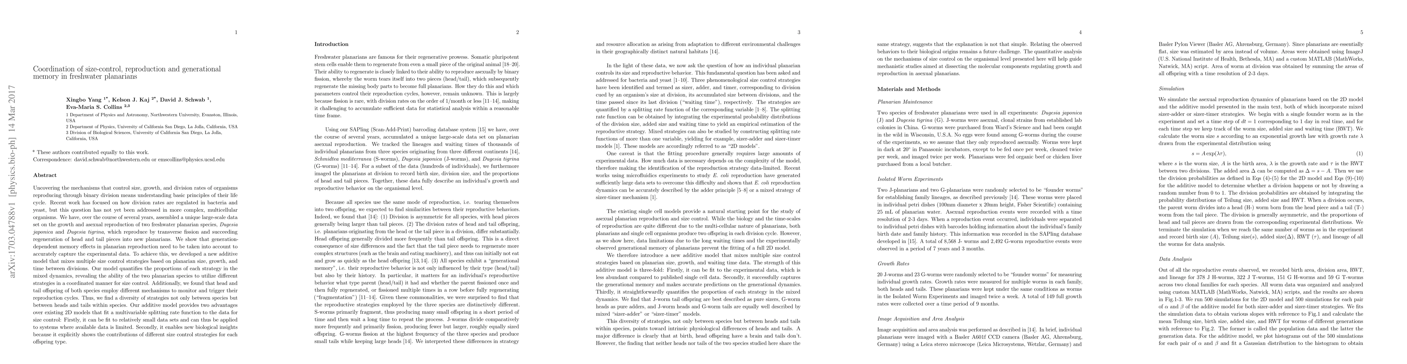 This research presents a novel model for understanding size control, reproduction, and generational memory in freshwater planarians. By analyzing two species, Dugesia japonica and Dugesia tigrina, the study reveals distinct size control strategies in head and tail offspring, both within and between species. The model, which can be fitted to smaller datasets, offers insights into coordinated strategies for size regulation in multicellular organisms.