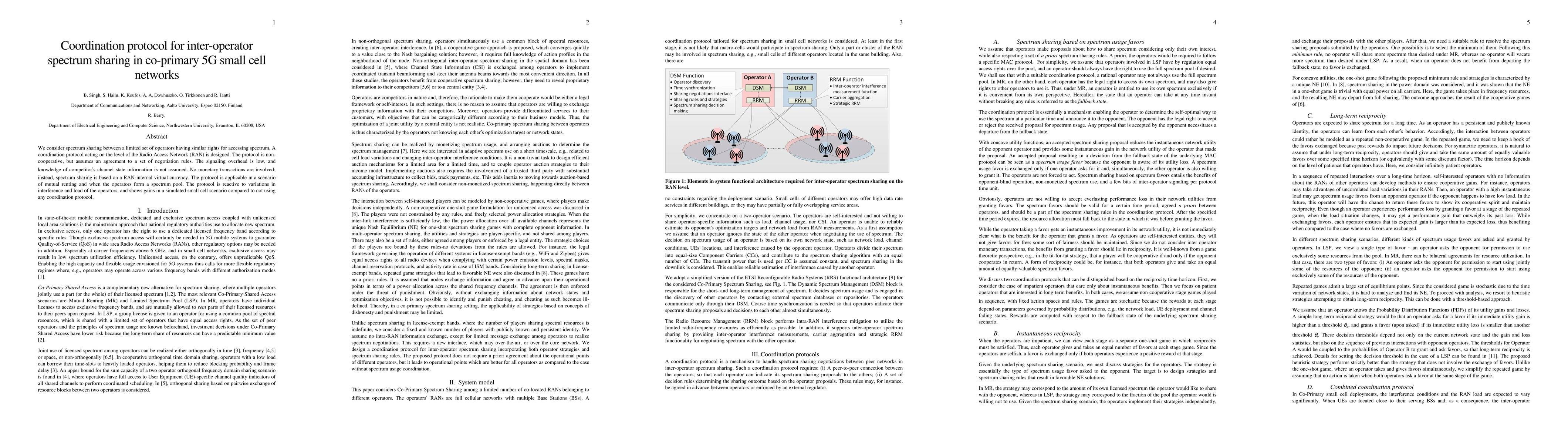 We consider spectrum sharing between a limited set of operators having similar rights for accessing spectrum. A coordination protocol acting on the level of the Radio Access Network (RAN) is designed. The protocol is non-cooperative, but assumes an agreement to a set of negotiation rules. The signaling overhead is low, and knowledge of competitor's channel state information is not assumed. No monetary transactions are involved; instead, spectrum sharing is based on a RAN-internal virtual currency. The protocol is applicable in a scenario of mutual renting and when the operators form a spectrum pool. The protocol is reactive to variations in interference and load of the operators, and shows gains in a simulated small cell scenario compared to not using any coordination protocol.