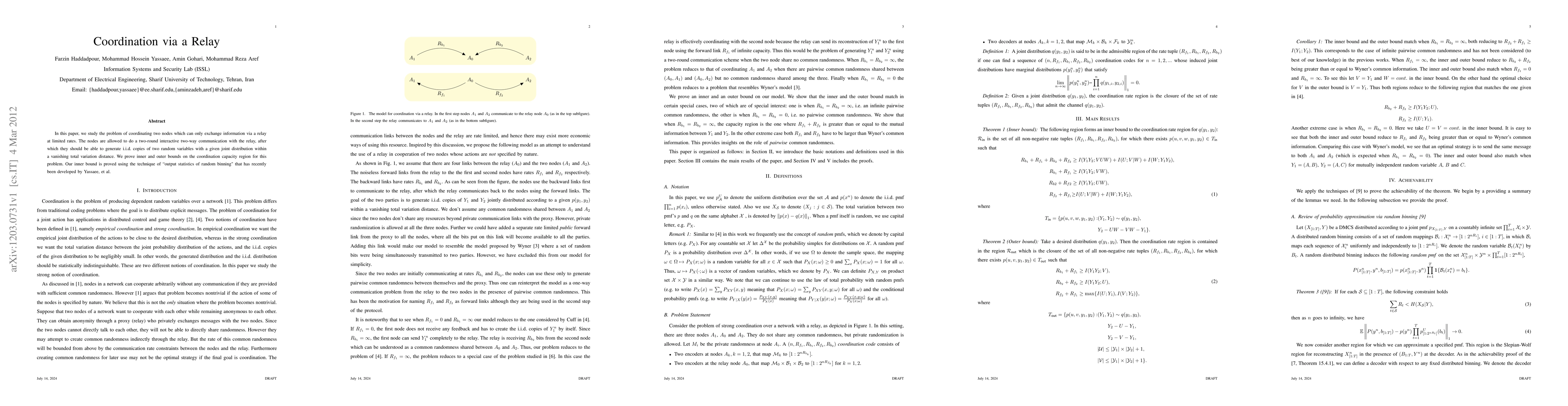 This research establishes inner and outer bounds for the coordination capacity region of two nodes communicating via a relay at limited rates. The methodology involves 'output statistics of random binning', enabling the nodes to generate i.i.d. copies of random variables with a given joint distribution within a vanishing total variation distance in two rounds of interaction.