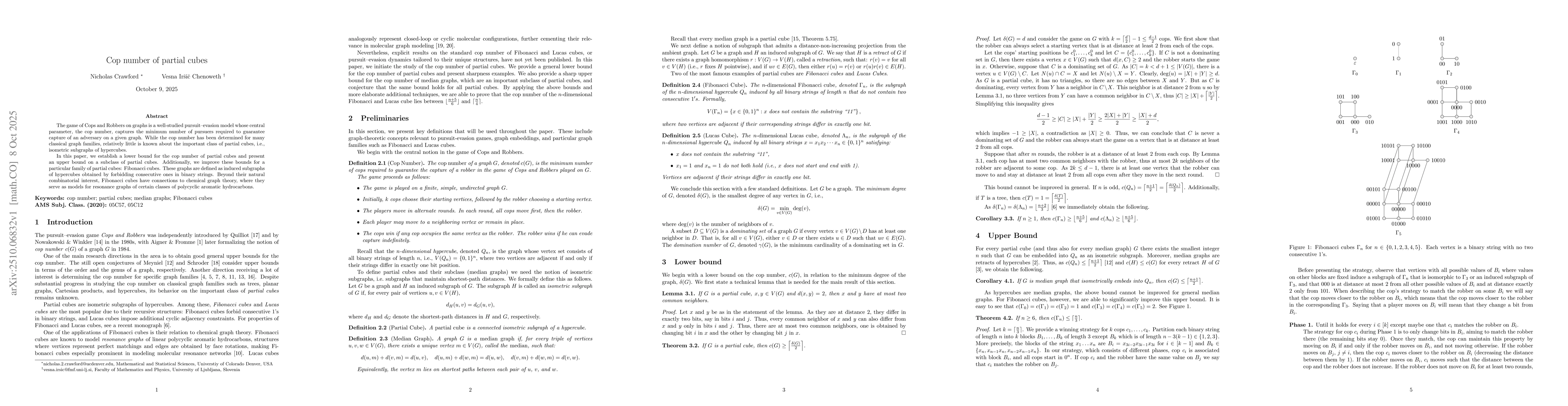 The work presents the first non-trivial bounds for the cop number of partial cubes, specifically improving known bounds for Fibonacci cubes and establishing general lower and upper bounds for this important graph class.
