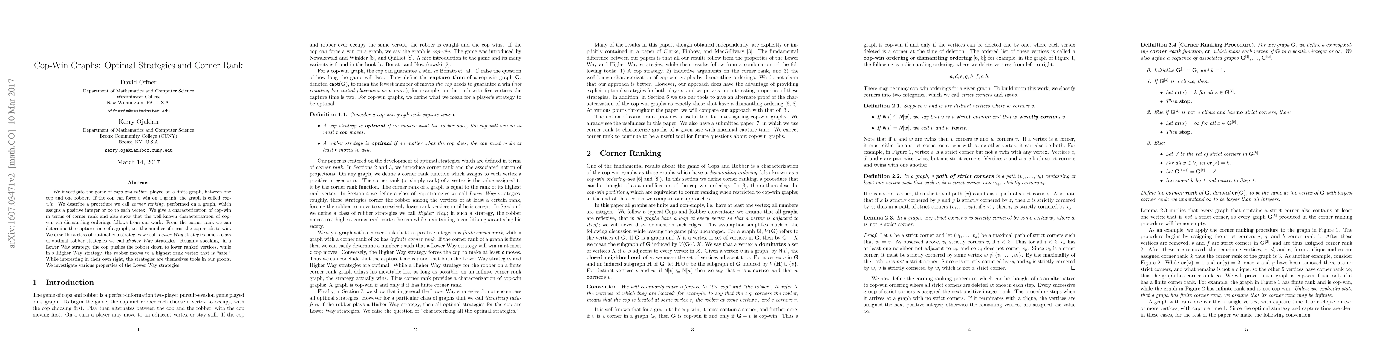 This paper explores the game of cops and robbers on finite graphs, introducing corner ranking to characterize cop-win graphs and determine capture times. It also presents Lower Way and Higher Way strategies for optimal cop and robber moves, respectively, using these strategies to prove various properties.