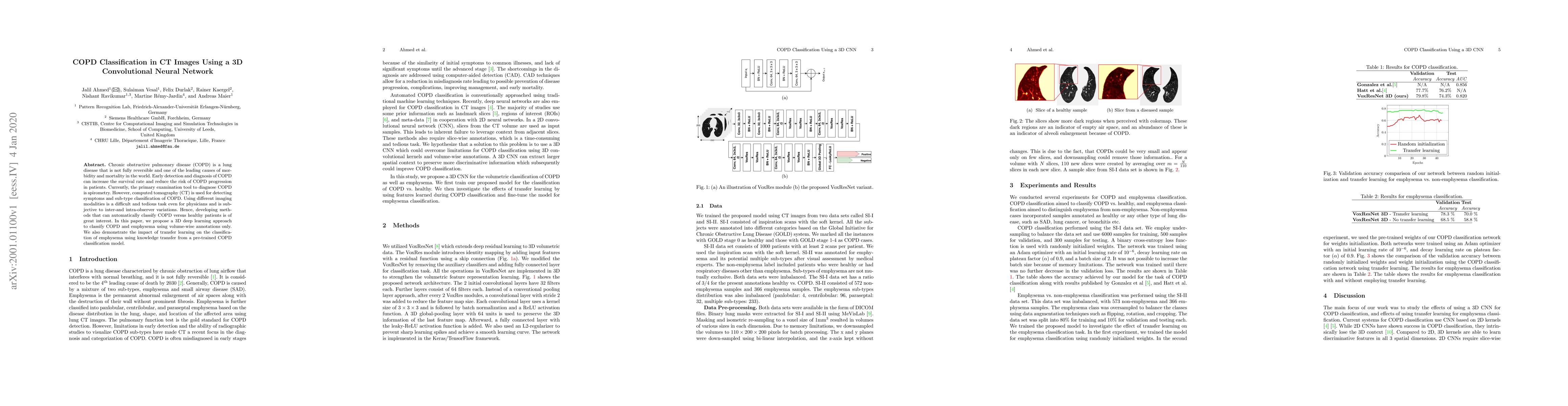 Chronic obstructive pulmonary disease (COPD) is a lung disease that is not fully reversible and one of the leading causes of morbidity and mortality in the world. Early detection and diagnosis of COPD can increase the survival rate and reduce the risk of COPD progression in patients. Currently, the primary examination tool to diagnose COPD is spirometry. However, computed tomography (CT) is used for detecting symptoms and sub-type classification of COPD. Using different imaging modalities is a difficult and tedious task even for physicians and is subjective to inter-and intra-observer variations. Hence, developing meth-ods that can automatically classify COPD versus healthy patients is of great interest. In this paper, we propose a 3D deep learning approach to classify COPD and emphysema using volume-wise annotations only. We also demonstrate the impact of transfer learning on the classification of emphysema using knowledge transfer from a pre-trained COPD classification model.