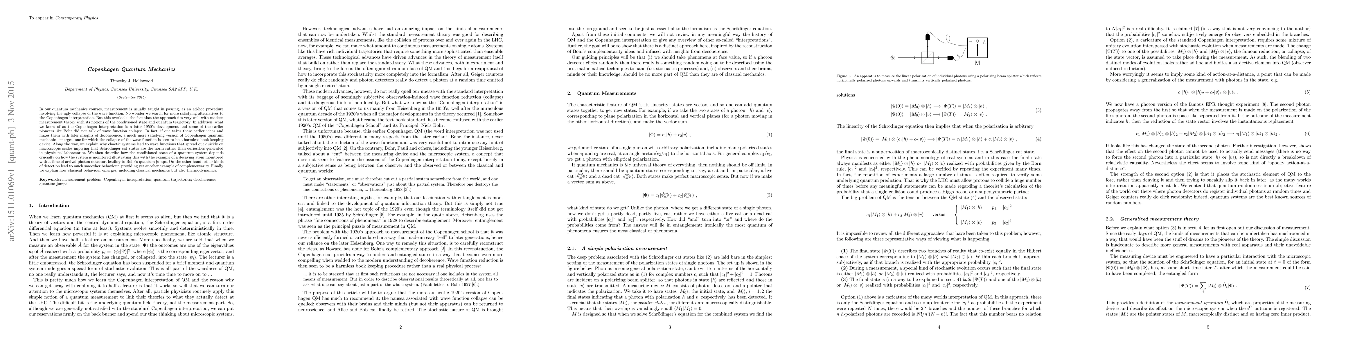 In our quantum mechanics courses, measurement is usually taught in passing, as an ad-hoc procedure involving the ugly collapse of the wave function. No wonder we search for more satisfying alternatives to the Copenhagen interpretation. But this overlooks the fact that the approach fits very well with modern measurement theory with its notions of the conditioned state and quantum trajectory. In addition, what we know of as the Copenhagen interpretation is a later 1950's development and some of the earlier pioneers like Bohr did not talk of wave function collapse. In fact, if one takes these earlier ideas and mixes them with later insights of decoherence, a much more satisfying version of Copenhagen quantum mechanics emerges, one for which the collapse of the wave function is seen to be a harmless book keeping device. Along the way, we explain why chaotic systems lead to wave functions that spread out quickly on macroscopic scales implying that Schrodinger cat states are the norm rather than curiosities generated in physicists' laboratories. We then describe how the conditioned state of a quantum system depends crucially on how the system is monitored illustrating this with the example of a decaying atom monitored with a time of arrival photon detector, leading to Bohr's quantum jumps. On the other hand, other kinds of detection lead to much smoother behaviour, providing yet another example of complementarity. Finally we explain how classical behaviour emerges, including classical mechanics but also thermodynamics.