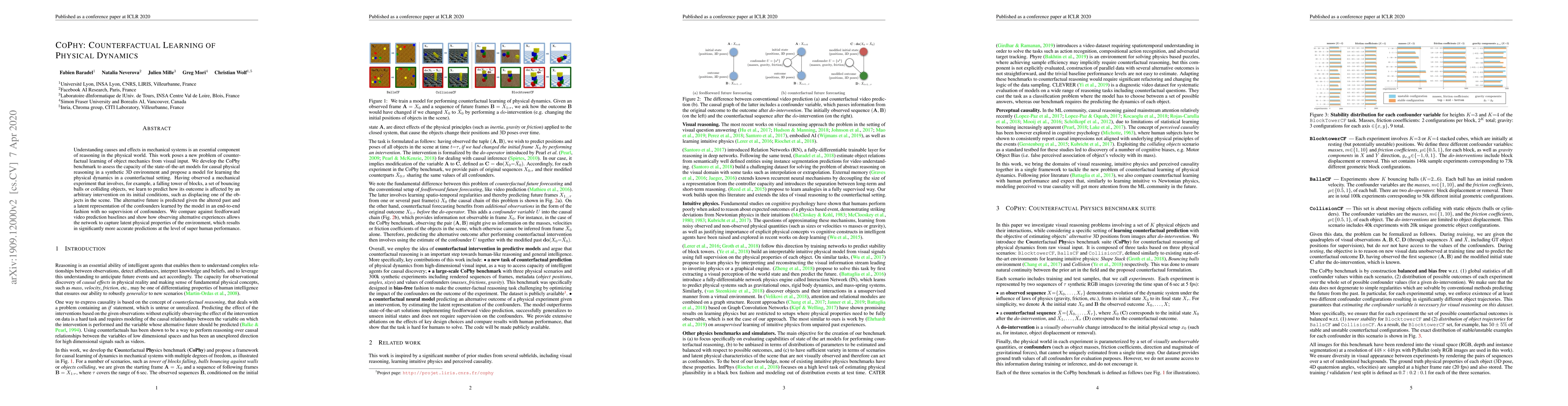 This paper introduces CoPhy, a benchmark for counterfactual learning of object mechanics from visual input, and proposes a model to predict the outcomes of mechanical experiments under arbitrary interventions. The model achieves superhuman-level accuracy by learning latent physical properties through observing alternative experiences, outperforming feedforward video prediction baselines.