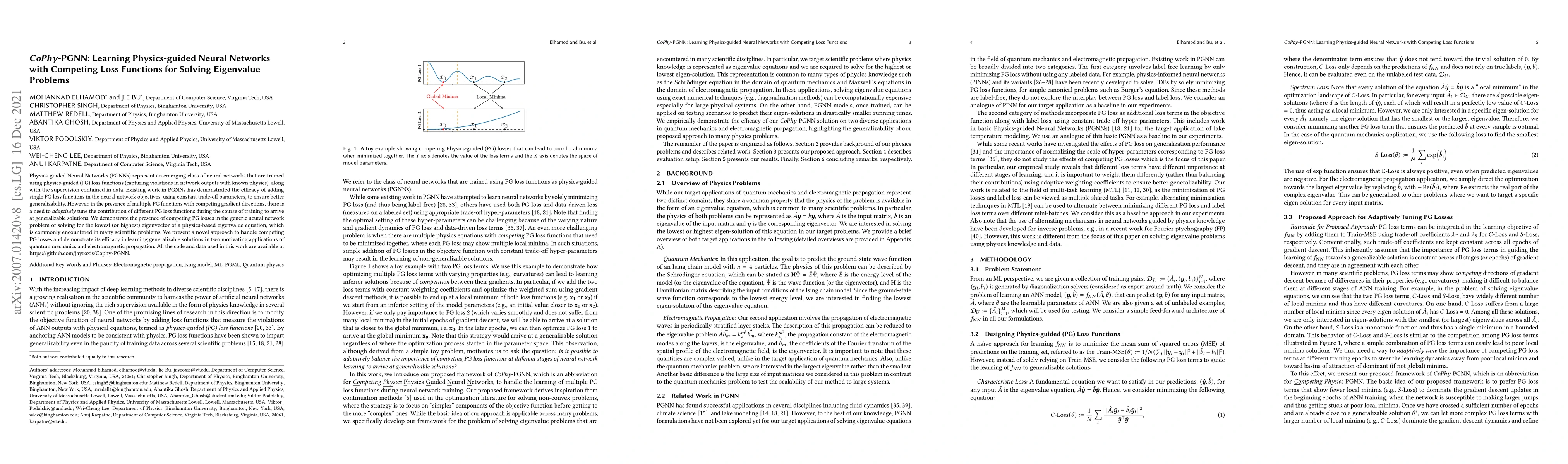 This paper introduces CoPhy-PGNN, a novel method for training Physics-guided Neural Networks (PGNNs) using competing loss functions to adaptively balance their contributions during training. The approach is shown to effectively solve eigenvalue problems in quantum mechanics and electromagnetic propagation, demonstrating improved generalizability.