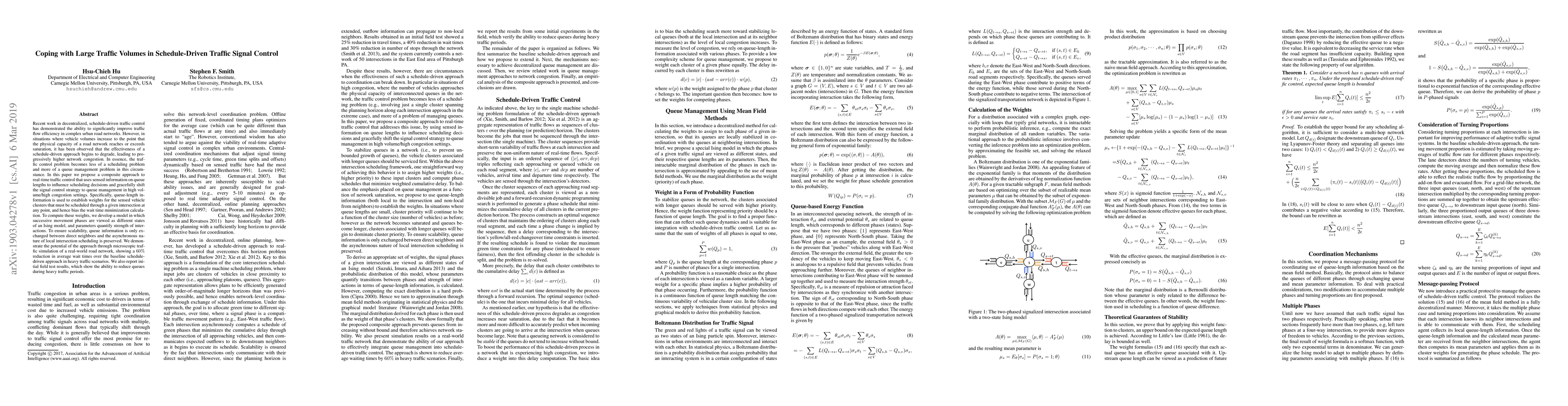 Recent work in decentralized, schedule-driven traffic control has demonstrated the ability to significantly improve traffic flow efficiency in complex urban road networks. However, in situations where vehicle volumes increase to the point that the physical capacity of a road network reaches or exceeds saturation, it has been observed that the effectiveness of a schedule-driven approach begins to degrade, leading to progressively higher network congestion. In essence, the traffic control problem becomes less of a scheduling problem and more of a queue management problem in this circumstance. In this paper we propose a composite approach to real-time traffic control that uses sensed information on queue lengths to influence scheduling decisions and gracefully shift the signal control strategy to queue management in high volume/high congestion settings. Specifically, queue-length information is used to establish weights for the sensed vehicle clusters that must be scheduled through a given intersection at any point, and hence bias the wait time minimization calculation. To compute these weights, we develop a model in which successive movement phases are viewed as different states of an Ising model, and parameters quantify strength of interactions. To ensure scalability, queue information is only exchanged between direct neighbors and the asynchronous nature of local intersection scheduling is preserved. We demonstrate the potential of the approach through microscopic traffic simulation of a real-world road network, showing a 60% reduction in average wait times over the baseline schedule-driven approach in heavy traffic scenarios. We also report initial field test results, which show the ability to reduce queues during heavy traffic periods.