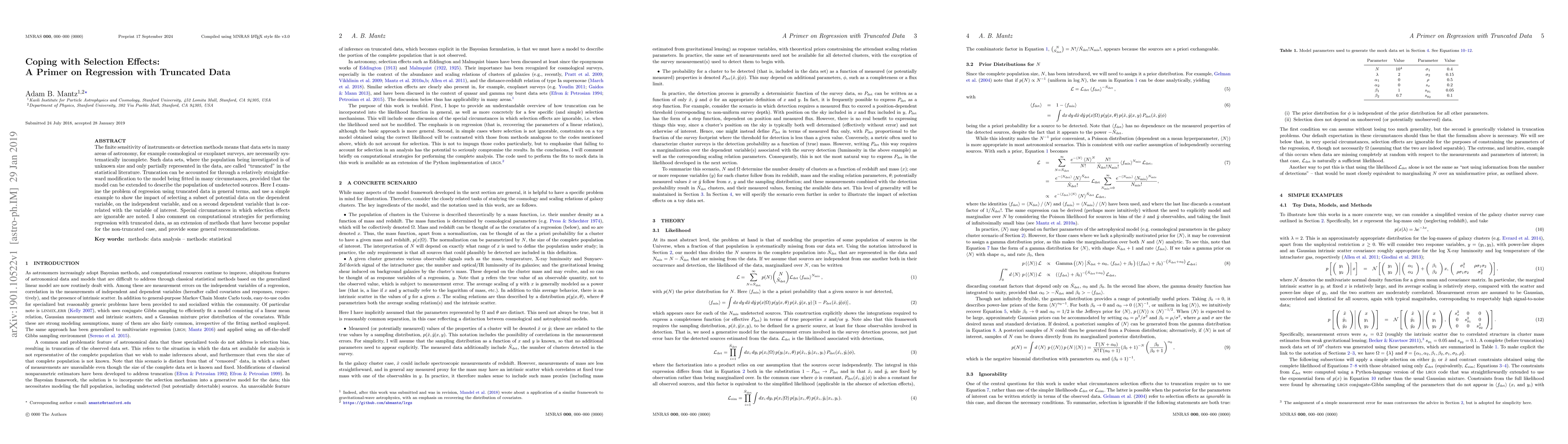 This paper discusses methods for regression analysis when dealing with truncated data, where only a subset of the population is observed due to instrument limitations. It highlights the impact of selection effects on both dependent and independent variables and provides strategies for accounting for these effects, along with computational recommendations for handling such data.