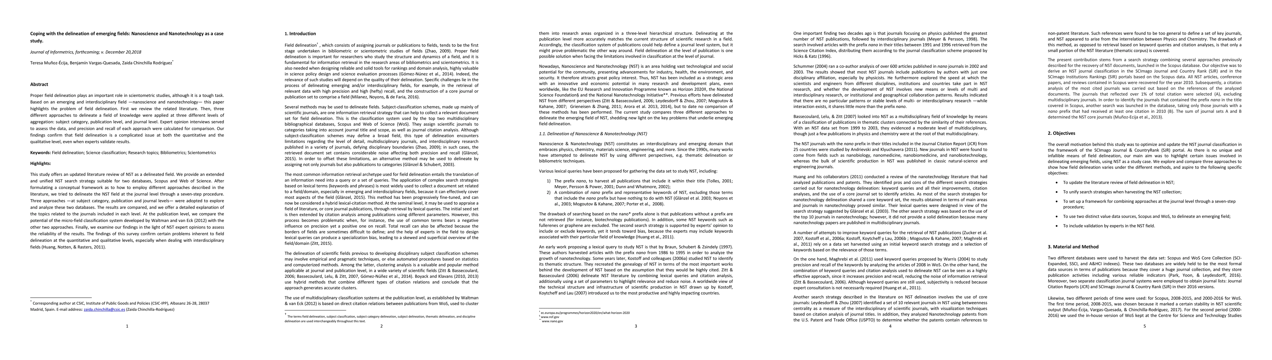 This paper investigates the challenges of delineating the emerging interdisciplinary field of nanoscience and nanotechnology. It employs three approaches at different aggregation levels and expert validation to assess precision and recall, revealing the complexity of field delineation both quantitatively and qualitatively.