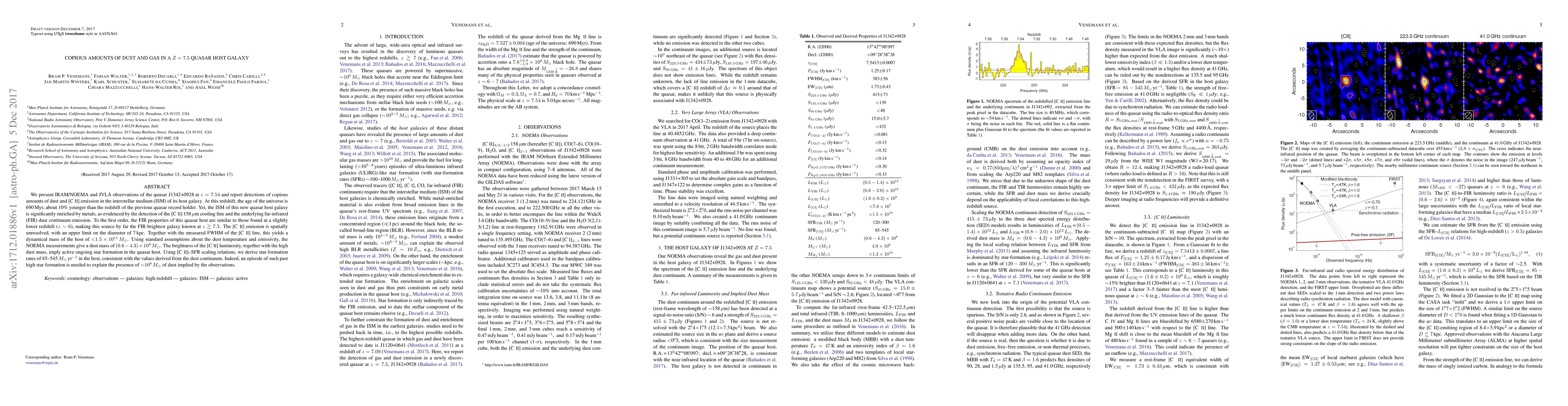 We present IRAM/NOEMA and JVLA observations of the quasar J1342+0928 at z=7.54 and report detections of copious amounts of dust and [CII] emission in the interstellar medium (ISM) of its host galaxy. At this redshift, the age of the universe is 690 Myr, about 10% younger than the redshift of the previous quasar record holder. Yet, the ISM of this new quasar host galaxy is significantly enriched by metals, as evidenced by the detection of the [CII] 158micron cooling line and the underlying far-infrared (FIR) dust continuum emission. To the first order, the FIR properties of this quasar host are similar to those found at a slightly lower redshift (z~6), making this source by far the FIR-brightest galaxy known at z>7.5. The [CII] emission is spatially unresolved, with an upper limit on the diameter of 7 kpc. Together with the measured FWHM of the [CII] line, this yields a dynamical mass of the host of <1.5x10^11 M_sun. Using standard assumptions about the dust temperature and emissivity, the NOEMA measurements give a dust mass of (0.6-4.3)x10^8 M_sun. The brightness of the [CII] luminosity, together with the high dust mass, imply active ongoing star formation in the quasar host. Using [CII]-SFR scaling relations, we derive star formation rates of 85-545 M_sun/yr in the host, consistent with the values derived from the dust continuum. Indeed, an episode of such past high star formation is needed to explain the presence of ~10^8 M_sun of dust implied by the observations.