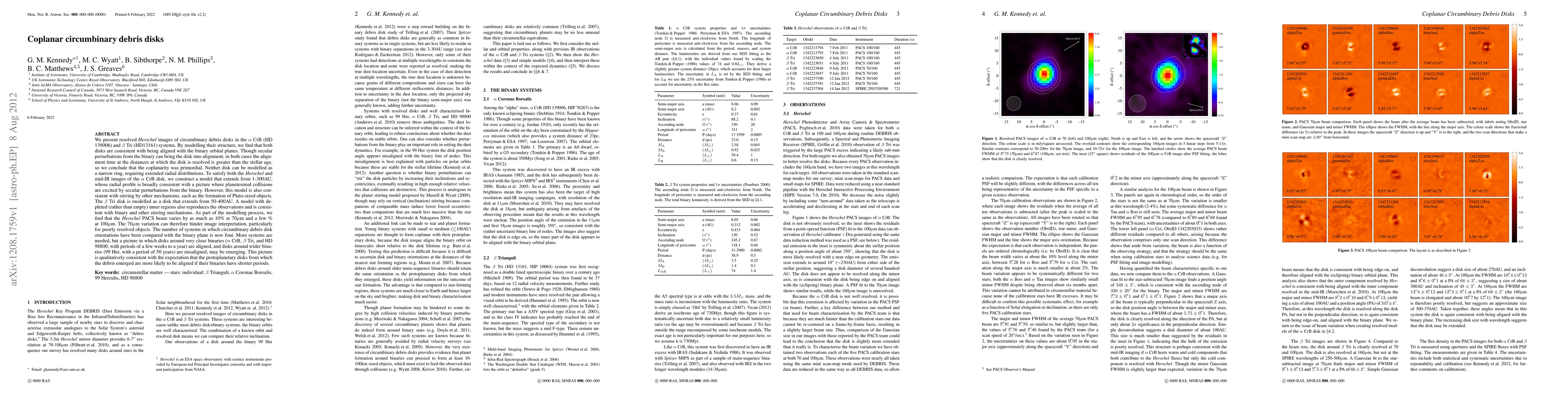 This paper presents Herschel images of circumbinary debris disks in the alpha CrB and beta Tri systems, finding both disks aligned with the binary orbital planes. The coplanarity is likely primordial, and neither disk can be modeled as a narrow ring, requiring extended radial distributions.