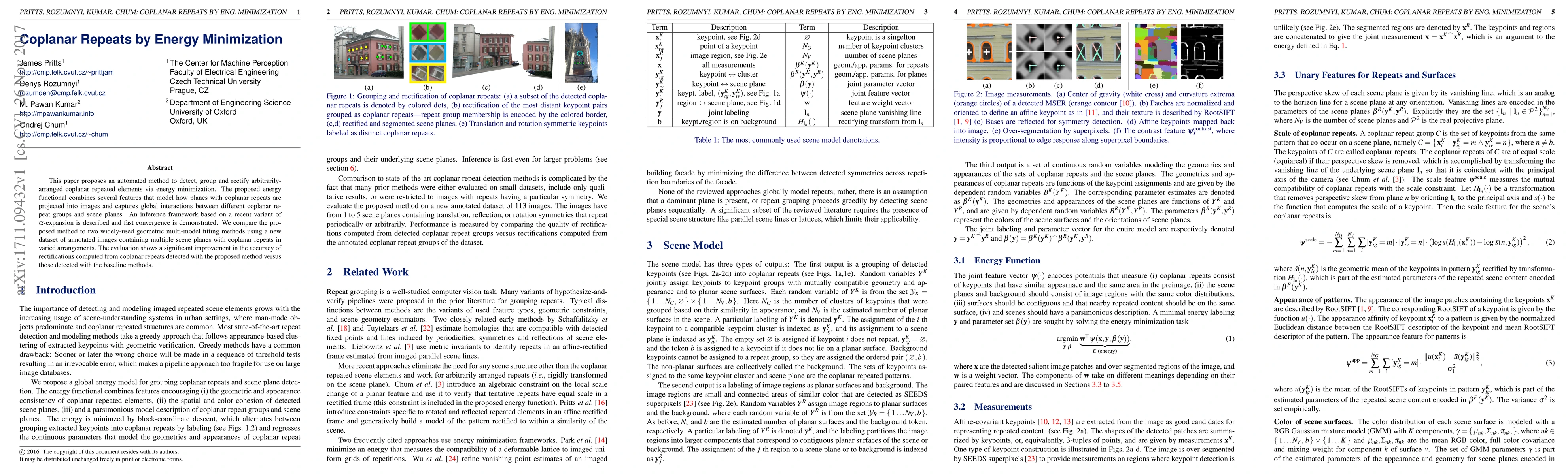 This paper introduces an automated method for detecting, grouping, and rectifying coplanar repeated elements using energy minimization, showing improved accuracy over existing geometric methods. The method leverages an energy functional and an $\alpha$-expansion inference framework to achieve fast convergence and better results on a new annotated dataset.