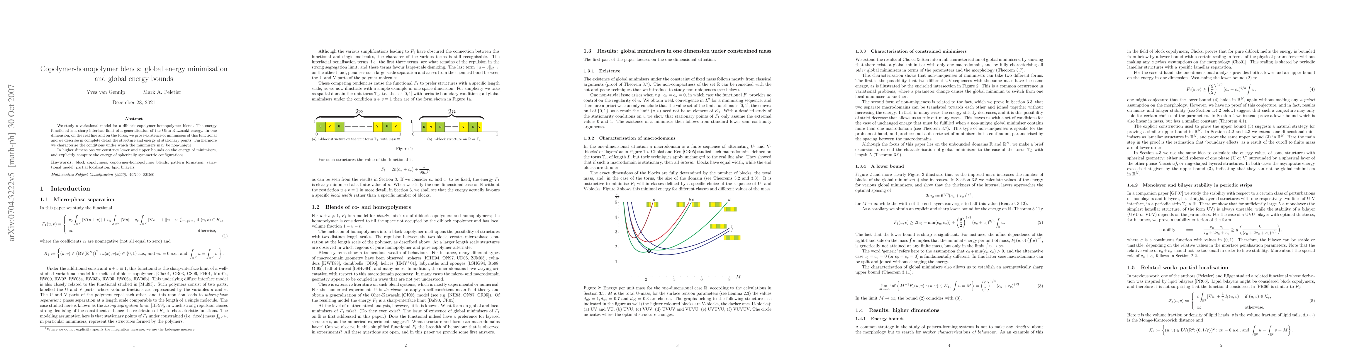 This paper explores a variational model for diblock-copolymer/homopolymer blends, proving the existence of minimisers in one dimension and detailing their structure. In higher dimensions, it constructs global energy bounds and computes the energy of spherically symmetric configurations, characterising conditions for non-unique minimisers.
