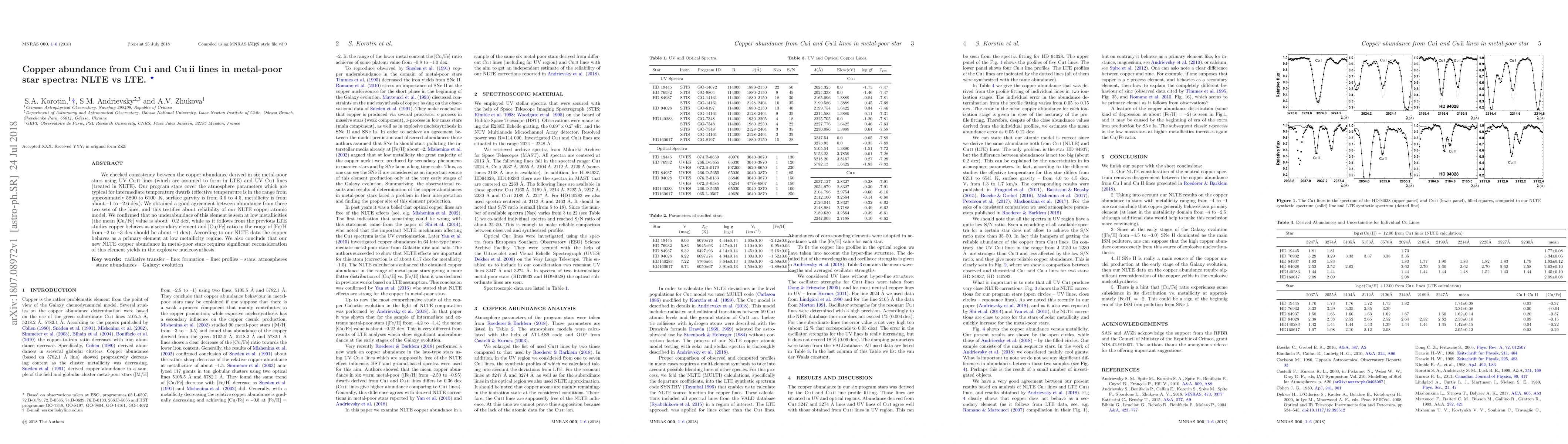 This study compares copper abundances derived from Cu I and Cu II lines in metal-poor stars, finding good agreement between NLTE and LTE methods, confirming copper as a primary element at low metallicity and suggesting a reevaluation of copper yields in explosive nucleosynthesis.