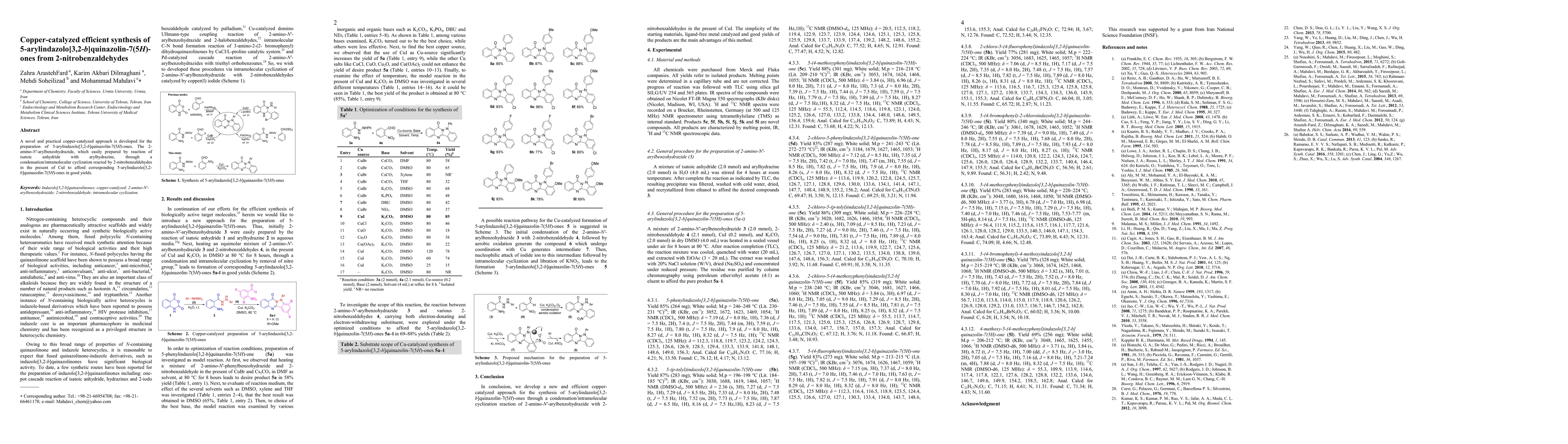 A novel and practical copper-catalyzed approach is developed for the preparation of 5-arylindazolo[3,2-b]quinazolin-7(5H)-ones. The 2-amino-N'-arylbenzohydrazide, which easily prepared by reaction of isatoic anhydride with arylhydrazine, through a condensation/intramolecular cyclization reacted by 2-nitrobenzaldehydes in the present of CuI to afford corresponding 5-arylindazolo[3,2-b]quinazolin-7(5H)-ones in good yields.