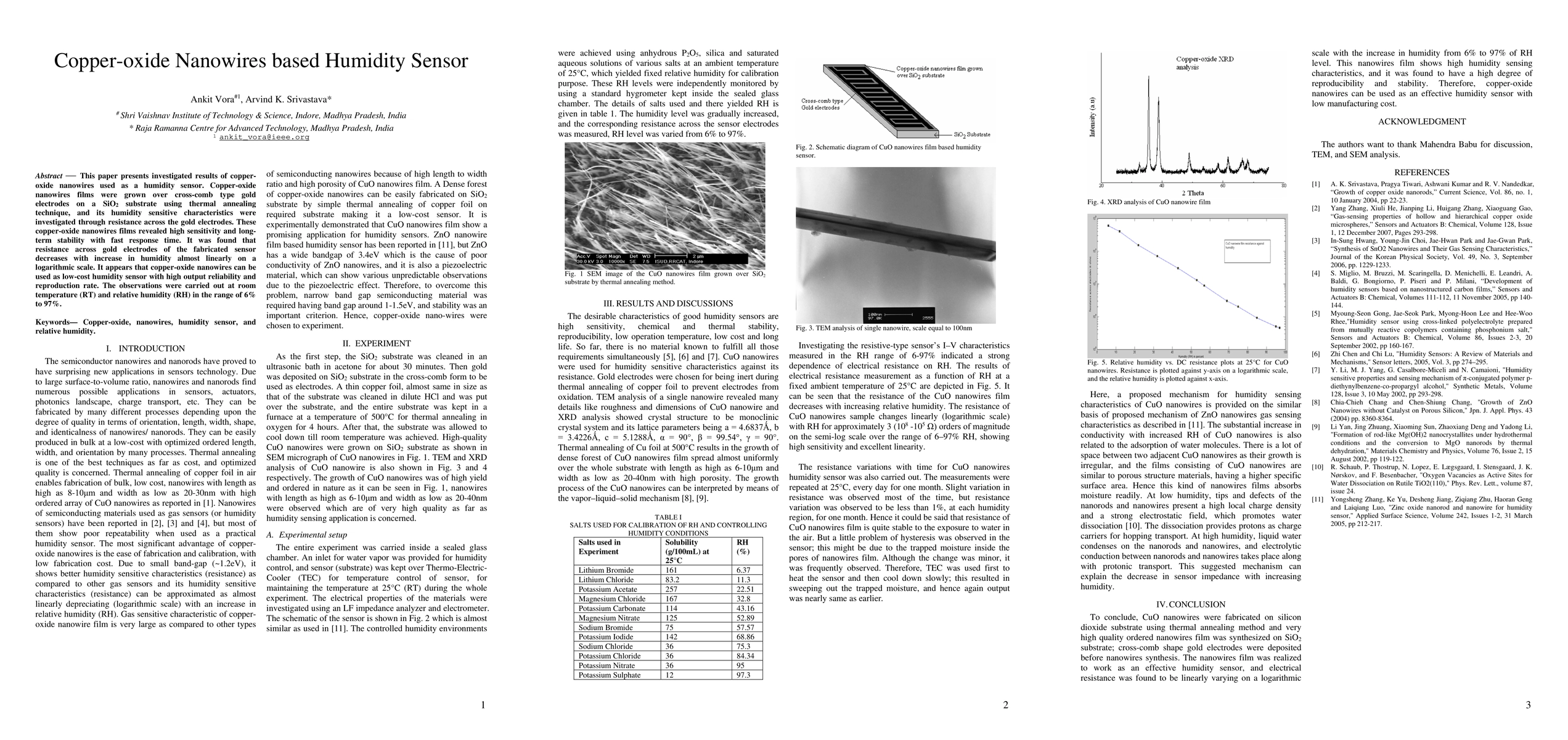 This paper investigates copper-oxide nanowires grown on gold electrodes for use as a humidity sensor, showing high sensitivity and stability with a fast response. The resistance decreases linearly with increasing humidity, indicating potential for low-cost, reliable humidity detection.