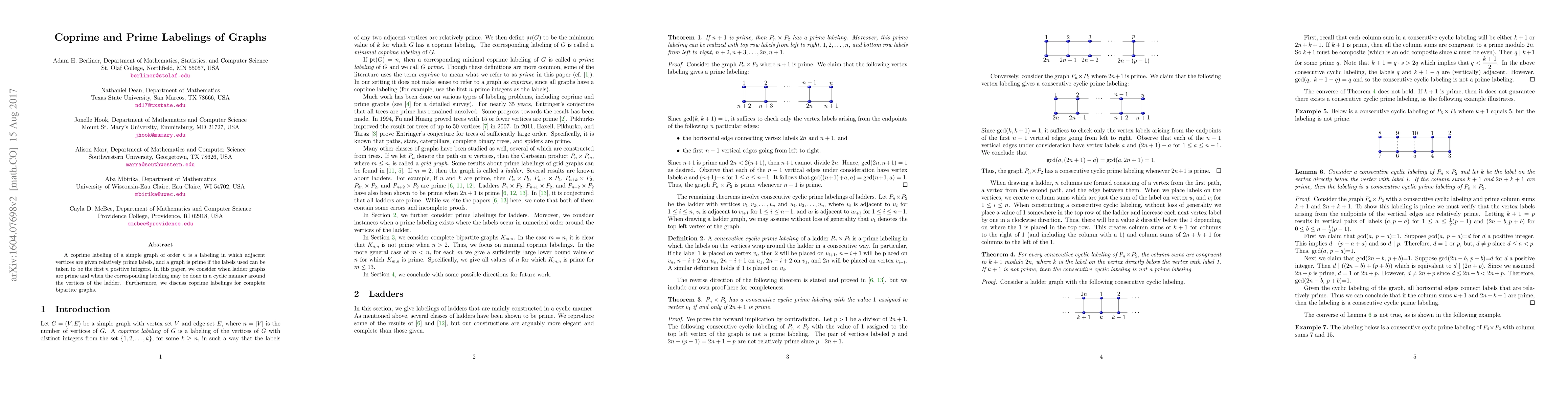A coprime labeling of a simple graph of order $n$ is a labeling in which adjacent vertices are given relatively prime labels, and a graph is prime if the labels used can be taken to be the first $n$ positive integers. In this paper, we consider when ladder graphs are prime and when the corresponding labeling may be done in a cyclic manner around the vertices of the ladder. Furthermore, we discuss coprime labelings for complete bipartite graphs.