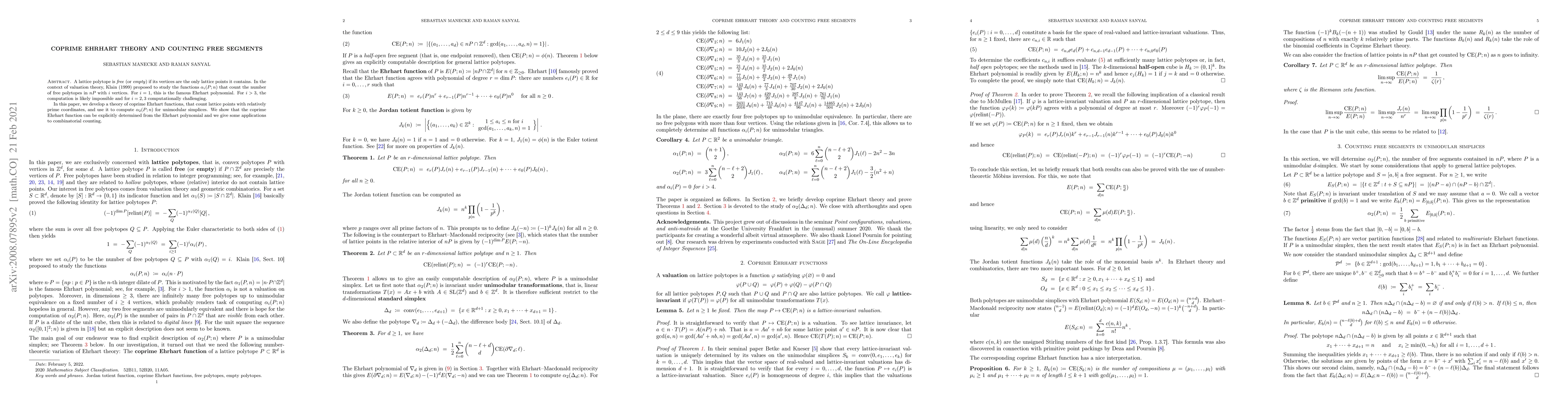 A lattice polytope is "free" (or "empty") if its vertices are the only lattice points it contains. In the context of valuation theory, Klain (1999) proposed to study the functions $\alpha_i(P;n)$ that count the number of free polytopes in $nP$ with $i$ vertices. For $i=1$, this is the famous Ehrhart polynomial. For $i > 3$, the computation is likely impossible and for $i=2,3$ computationally challenging. In this paper, we develop a theory of coprime Ehrhart functions, that count lattice points with relatively prime coordinates, and use it to compute $\alpha_2(P;n)$ for unimodular simplices. We show that the coprime Ehrhart function can be explicitly determined from the Ehrhart polynomial and we give some applications to combinatorial counting.