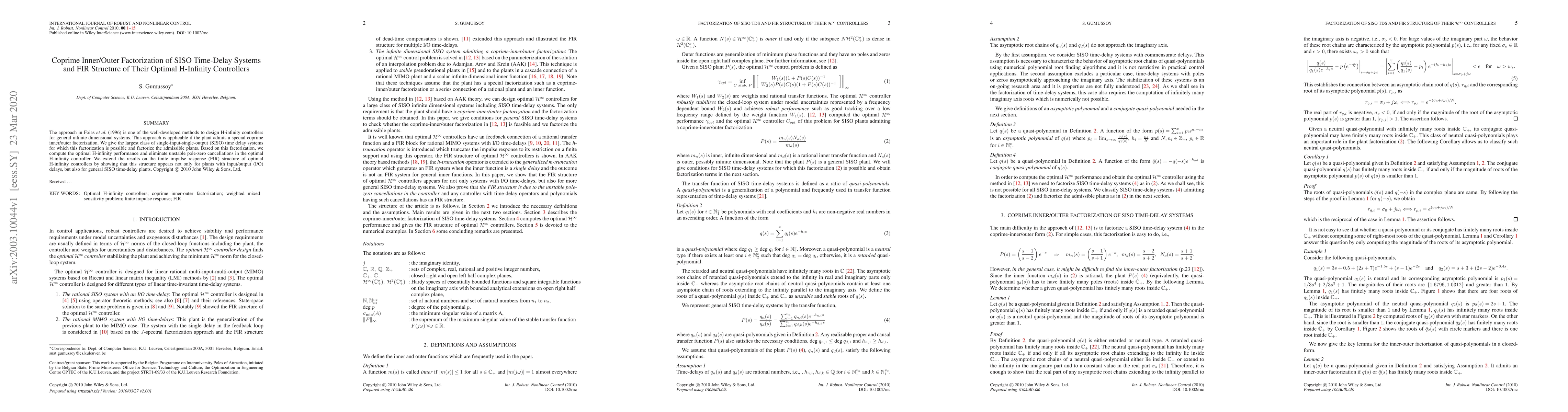 This paper extends the coprime inner/outer factorization method for designing optimal H-infinity controllers, focusing on single-input-single-output time-delay systems. It identifies the largest class of such systems allowing this factorization and demonstrates the finite impulse response structure of the resulting optimal controllers.
