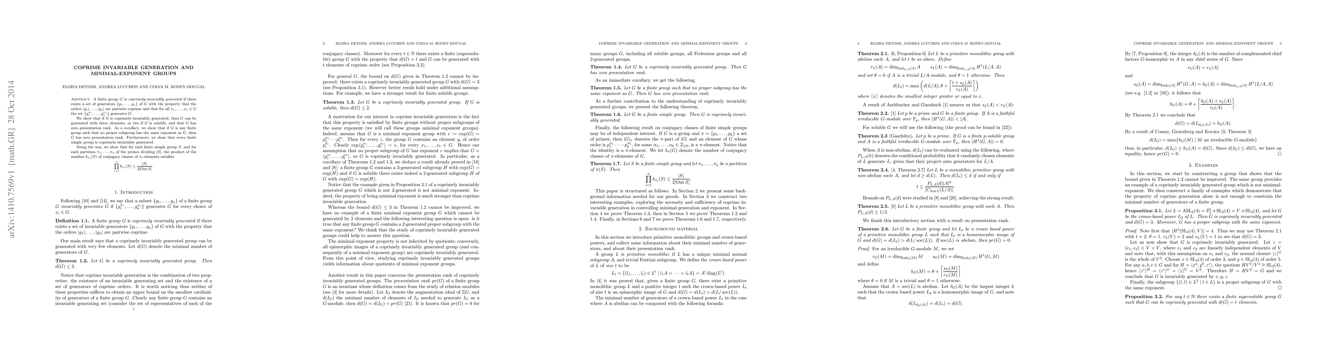A finite group $G$ is \emph{coprimely-invariably generated} if there exists a set of generators $\{g_1, ..., g_u\}$ of $G$ with the property that the orders $|g_1|, ..., |g_u|$ are pairwise coprime and that for all $x_1, ..., x_u \in G$ the set $\{g_1^{x_1}, ..., g_u^{x_u}\}$ generates $G$. We show that if $G$ is coprimely-invariably generated, then $G$ can be generated with three elements, or two if $G$ is soluble, and that $G$ has zero presentation rank. As a corollary, we show that if $G$ is any finite group such that no proper subgroup has the same exponent as $G$, then $G$ has zero presentation rank. Furthermore, we show that every finite simple group is coprimely-invariably generated. Along the way, we show that for each finite simple group $S$, and for each partition $\pi_1, ..., \pi_u$ of the primes dividing $|S|$, the product of the number $k_{\pi_i}(S)$ of conjugacy classes of $\pi_i$-elements satisfies $\prod_{i=1}^u k_{\pi_i}(S) \leq \frac{|S|}{2| Out S|}.$