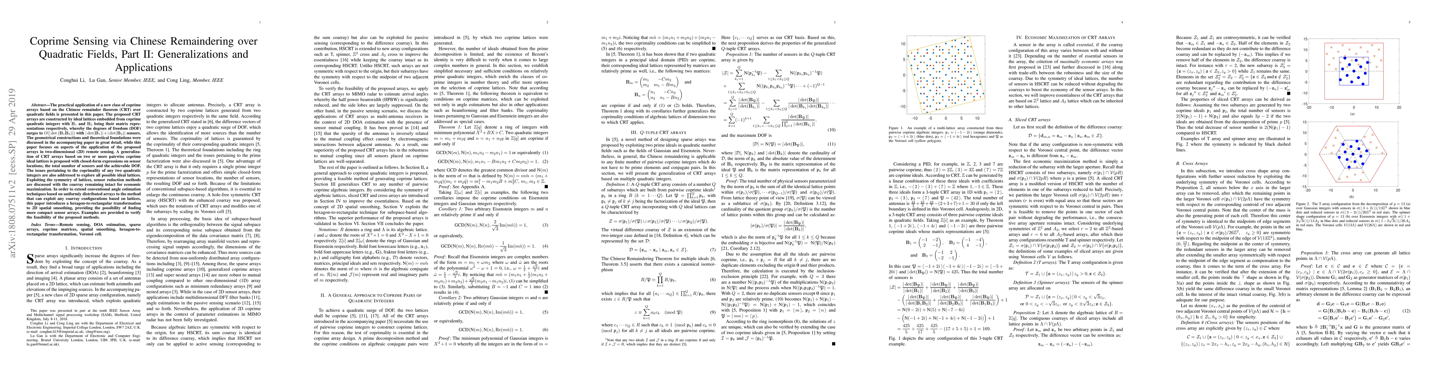 The practical application of a new class of coprime arrays based on the Chinese remainder theorem (CRT) over quadratic fields is presented in this paper. The proposed CRT arrays are constructed by ideal lattices embedded from coprime quadratic integers. The geometrical constructions and theoretical foundations were discussed in the accompanying paper in great detail, while this paper focuses on aspects of the application of the proposed arrays in two-dimensional (2D) remote sensing. A generalization of CRT arrays based on two or more pairwise coprime ideal lattices is proposed with closed-form expressions on sensor locations, the total number of sensors and the achievable DOF. The issues pertaining to the coprimality of any two quadratic integers are also addressed to explore all possible ideal lattices. Exploiting the symmetry of lattices, sensor reduction methods are discussed with the coarray remaining intact for economic maximization. In order to extend conventional angle estimation techniques based on uniformly distributed arrays to the method that can exploit any coarray configurations based on lattices, this paper introduces a hexagon-to-rectangular transformation to 2D spatial smoothing, providing the possibility of finding more compact sensor arrays. Examples are provided to verify the feasibility of the proposed methods.