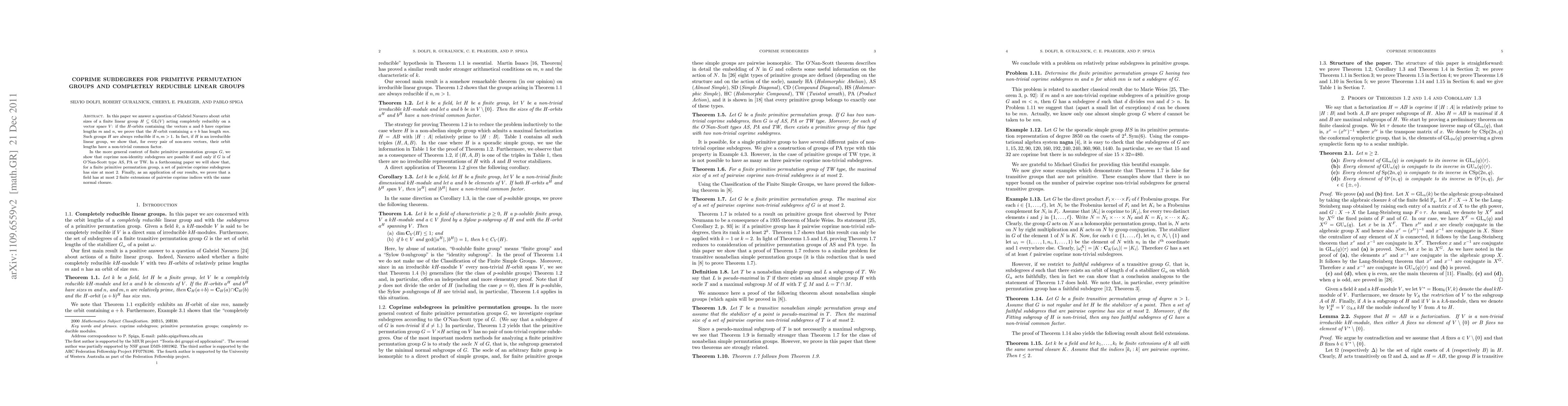 In this paper we answer a question of Gabriel Navarro about orbit sizes of a finite linear group H acting completely reducibly on a vector space V: if the orbits containing the vectors a and b have coprime lengths m and n, we prove that the orbit containing a+b has length mn. Such groups H are always reducible if n and m are greater than 1. In fact, if H is an irreducible linear group, we show that, for every pair of non-zero vectors, their orbit lengths have a non-trivial common factor. In the more general context of finite primitive permutation groups G, we show that coprime non-identity subdegrees are possible if and only if G is of O'Nan-Scott type AS, PA or TW. In a forthcoming paper we will show that, for a finite primitive permutation group, a set of pairwise coprime subdegrees has size at most 2. Finally, as an application of our results, we prove that a field has at most 2 finite extensions of pairwise coprime indices with the same normal closure.