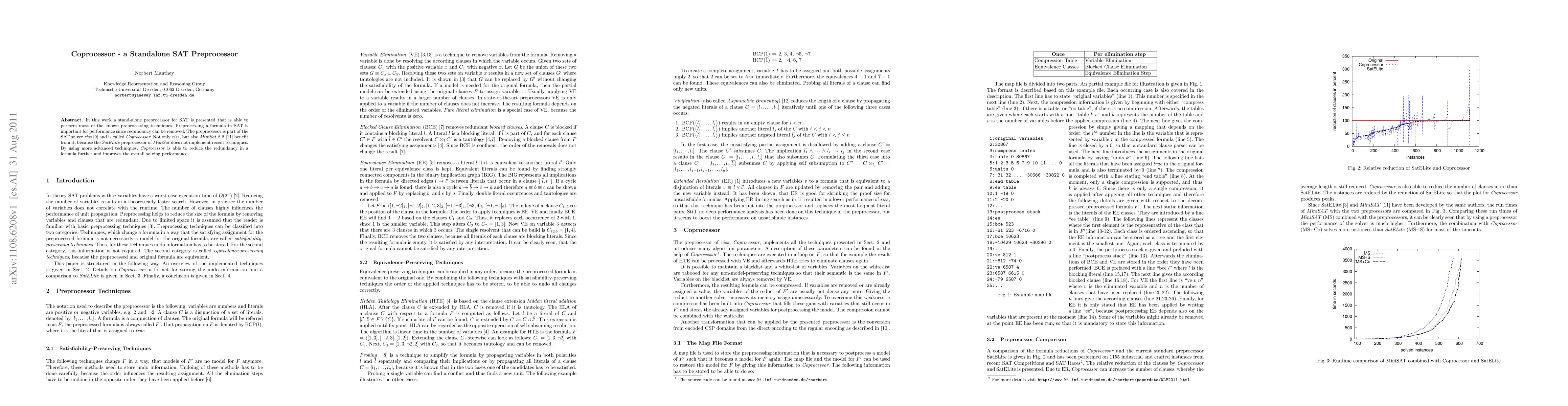 Coprocessor, a robust and configurable standalone SAT preprocessor, integrating multiple preprocessing techniques to improve SAT solving performance.