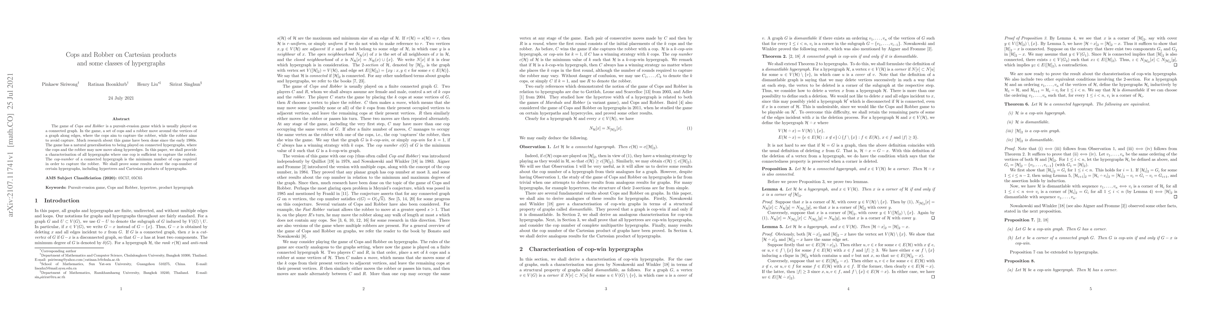 This paper studies the Cops and Robber game on connected hypergraphs, generalizing the game from graphs to hyperedges. It characterizes hypergraphs requiring one cop to capture the robber and investigates the cop-number for hypertrees and Cartesian products of hypergraphs.