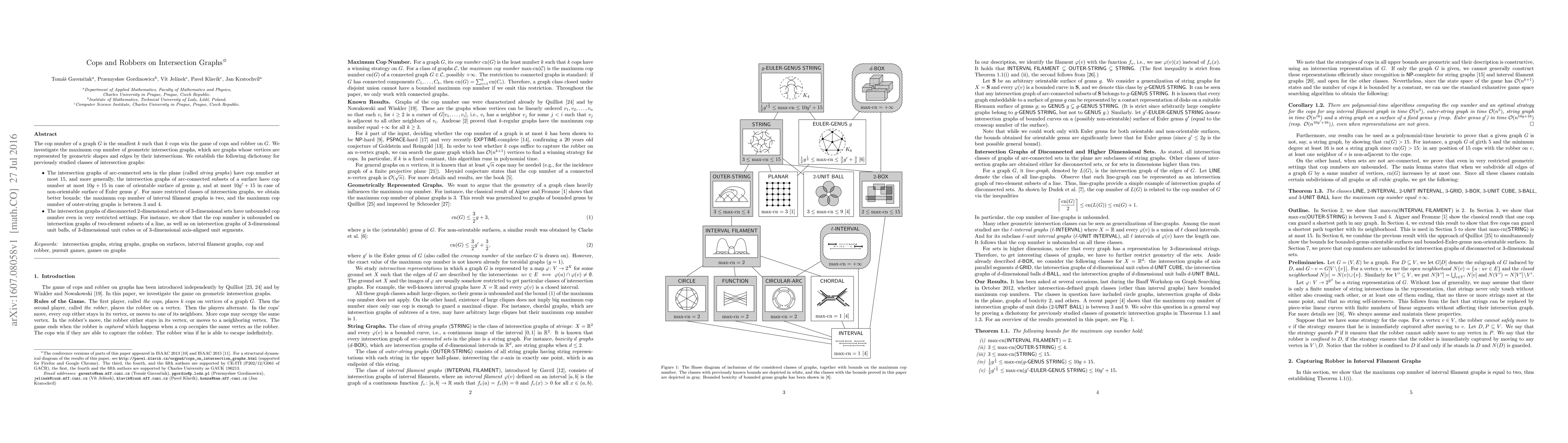 The paper establishes the cop number bounds for various classes of geometric intersection graphs, showing that arc-connected planar and surface intersection graphs have bounded cop numbers, while intersection graphs of disconnected 2D sets and 3D sets exhibit unbounded cop numbers. Specific results include a cop number of at most 15 for string graphs and a cop number bound of $10g+15$ for intersection graphs on orientable surfaces of genus $g$.