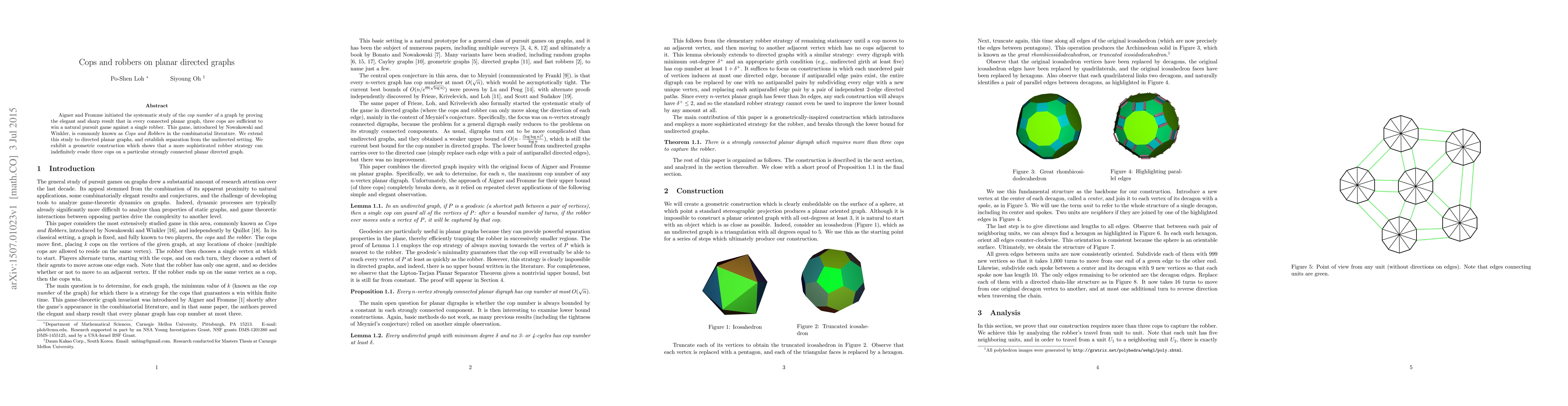 Summary: This paper extends the Cops and Robbers game to directed planar graphs, demonstrating that three cops are insufficient to always catch a robber on such graphs, contrasting with the three-cop sufficiency on undirected planar graphs. A specific geometric construction illustrates a scenario where a robber can evade capture indefinitely.