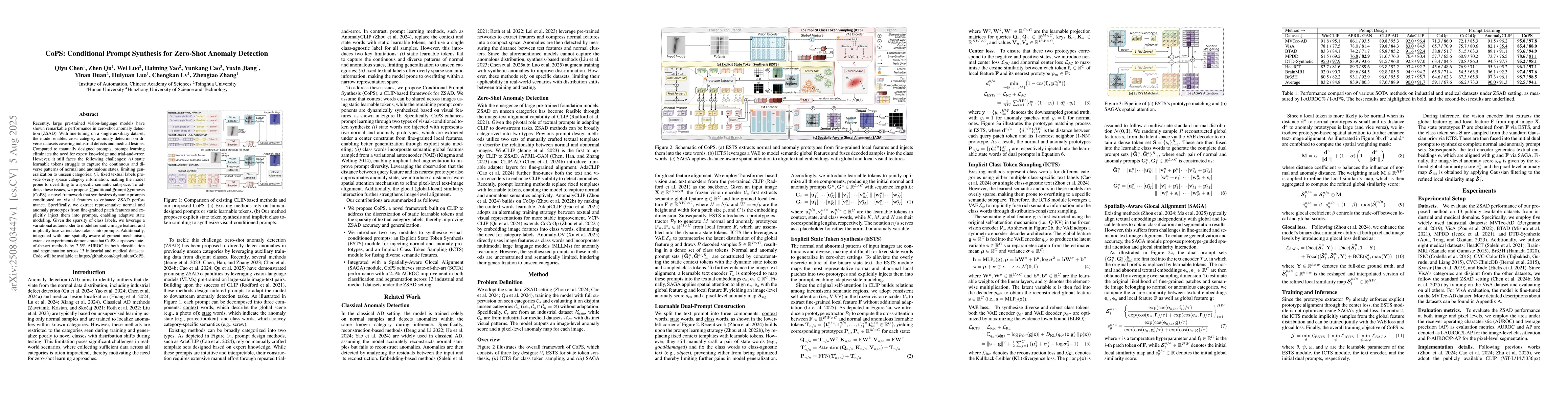 Recently, large pre-trained vision-language models have shown remarkable performance in zero-shot anomaly detection (ZSAD). With fine-tuning on a single auxiliary dataset, the model enables cross-category anomaly detection on diverse datasets covering industrial defects and medical lesions. Compared to manually designed prompts, prompt learning eliminates the need for expert knowledge and trial-and-error. However, it still faces the following challenges: (i) static learnable tokens struggle to capture the continuous and diverse patterns of normal and anomalous states, limiting generalization to unseen categories; (ii) fixed textual labels provide overly sparse category information, making the model prone to overfitting to a specific semantic subspace. To address these issues, we propose Conditional Prompt Synthesis (CoPS), a novel framework that synthesizes dynamic prompts conditioned on visual features to enhance ZSAD performance. Specifically, we extract representative normal and anomaly prototypes from fine-grained patch features and explicitly inject them into prompts, enabling adaptive state modeling. Given the sparsity of class labels, we leverage a variational autoencoder to model semantic image features and implicitly fuse varied class tokens into prompts. Additionally, integrated with our spatially-aware alignment mechanism, extensive experiments demonstrate that CoPS surpasses state-of-the-art methods by 2.5% AUROC in both classification and segmentation across 13 industrial and medical datasets. Code will be available at https://github.com/cqylunlun/CoPS.