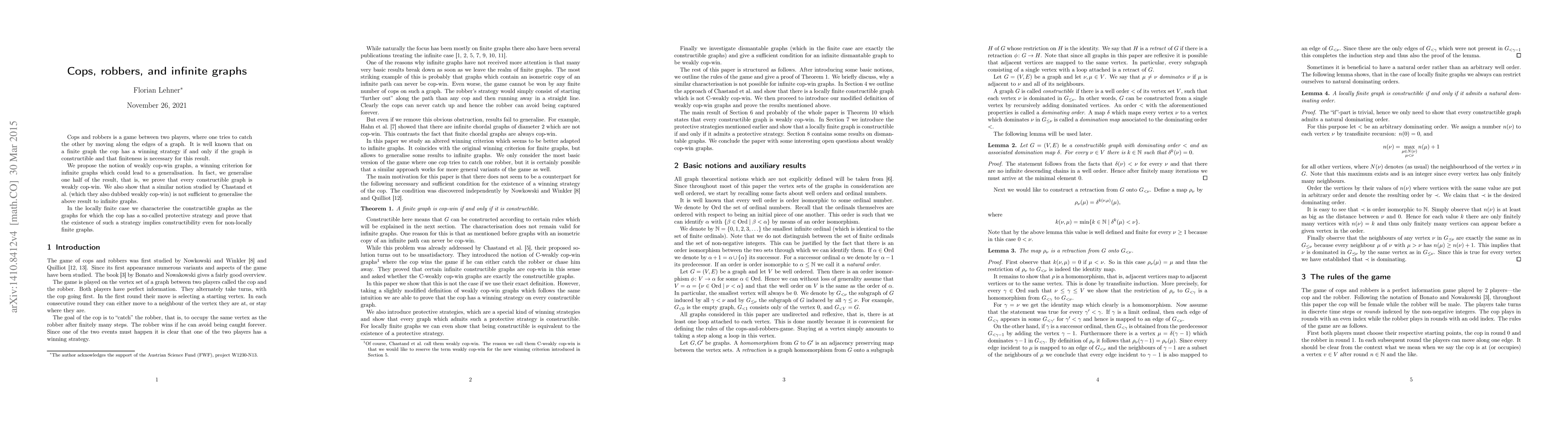 Cops and robbers is a game between two players, where one tries to catch the other by moving along the edges of a graph. It is well known that on a finite graph the cop has a winning strategy if and only if the graph is constructible and that finiteness is necessary for this result. We propose the notion of weakly cop-win graphs, a winning criterion for infinite graphs which could lead to a generalisation. In fact, we generalise one half of the result, that is, we prove that every constructible graph is weakly cop-win. We also show that a similar notion studied by Chastand et al. (which they also dubbed weakly cop-win) is not sufficient to generalise the above result to infinite graphs. In the locally finite case we characterise the constructible graphs as the graphs for which the cop has a so-called protective strategy and prove that the existence of such a strategy implies constructibility even for non-locally finite graphs.