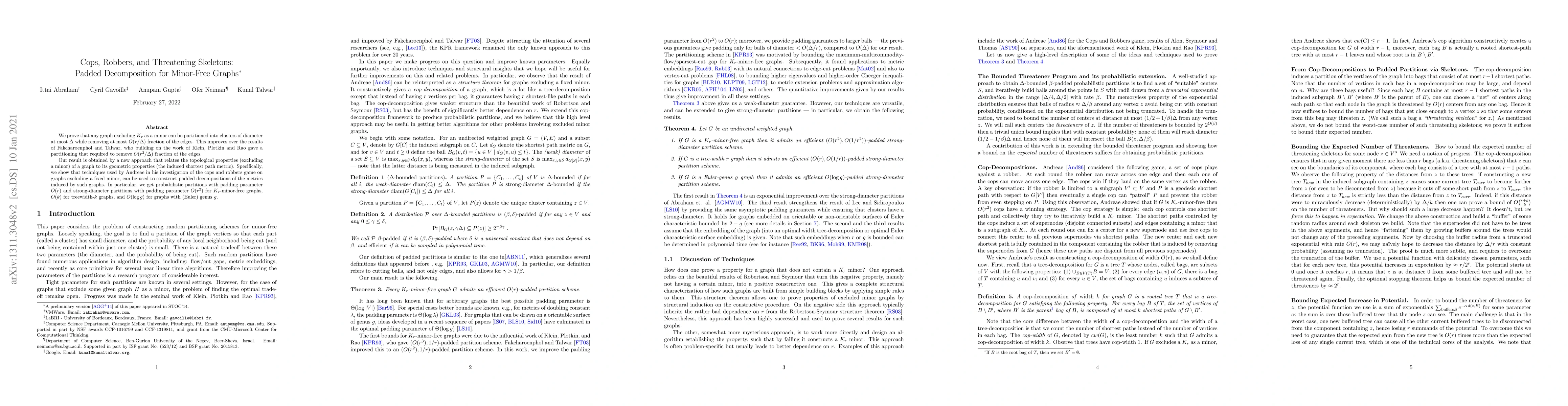 We prove that any graph excluding $K_r$ as a minor has can be partitioned into clusters of diameter at most $\Delta$ while removing at most $O(r/\Delta)$ fraction of the edges. This improves over the results of Fakcharoenphol and Talwar, who building on the work of Klein, Plotkin and Rao gave a partitioning that required to remove $O(r^2/\Delta)$ fraction of the edges. Our result is obtained by a new approach to relate the topological properties (excluding a minor) of a graph to its geometric properties (the induced shortest path metric). Specifically, we show that techniques used by Andreae in his investigation of the cops-and-robbers game on excluded-minor graphs can be used to construct padded decompositions of the metrics induced by such graphs. In particular, we get probabilistic partitions with padding parameter $O(r)$ and strong-diameter partitions with padding parameter $O(r^2)$ for $K_r$-free graphs, padding $O(k)$ for graphs with treewidth $k$, and padding $O(\log g)$ for graphs with genus $g$.
