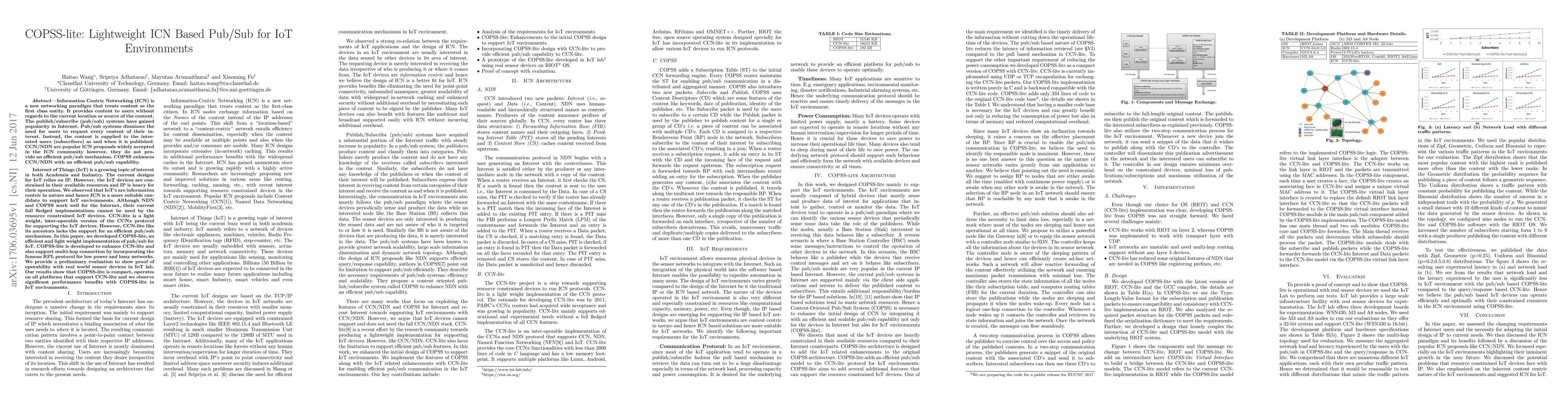 This paper introduces COPSS-lite, a lightweight publish/subscribe mechanism for Internet of Things (IoT) environments, enhancing CCN-lite with efficient pub/sub capabilities to support resource-constrained IoT devices while integrating RPL for multi-hop connections. Preliminary evaluations demonstrate its operability and significant performance benefits in IoT settings.
