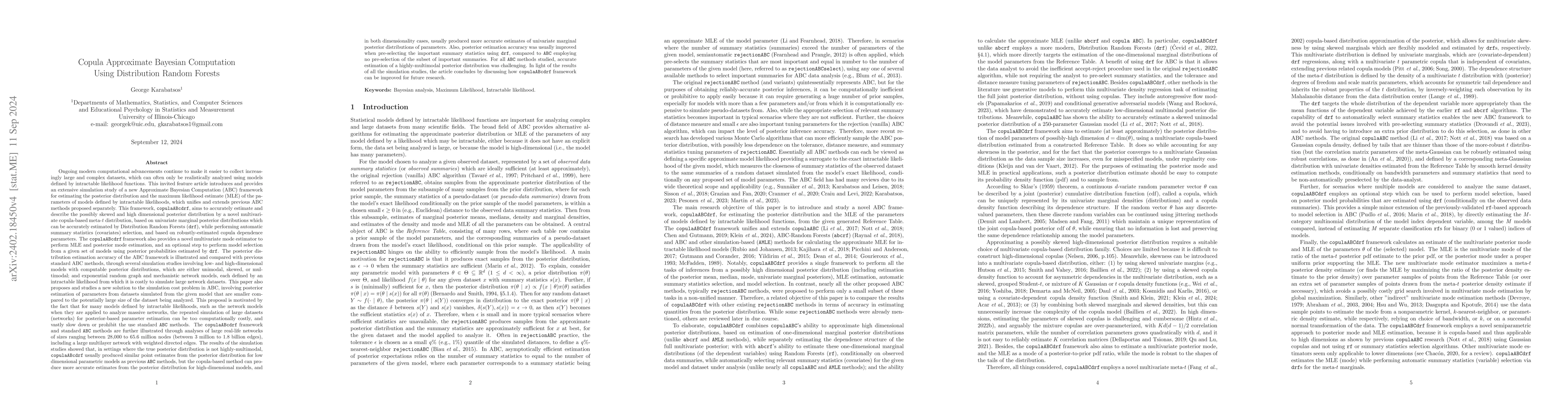 This paper proposes an innovative Approximate Bayesian Computation (ABC) framework using copula-based distribution and Distribution Random Forests for estimating posterior distributions and maximum likelihood estimates in models with intractable likelihoods. The framework accurately captures skewed, high-dimensional posterior distributions and performs automatic selection of summary statistics.