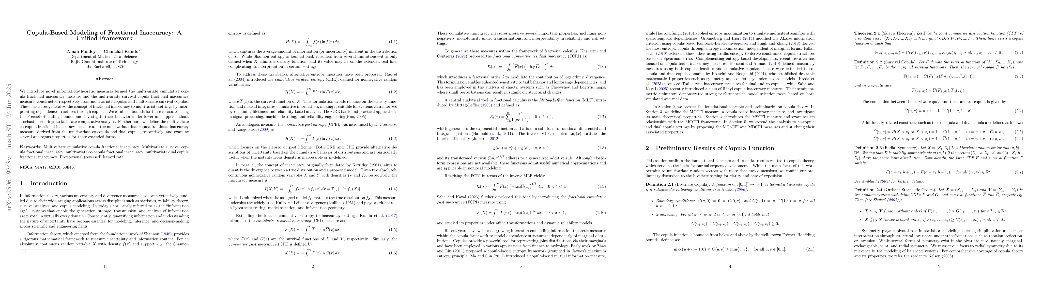 We introduce novel information-theoretic measures termed the multivariate cumulative copula fractional inaccuracy measure and the multivariate survival copula fractional inaccuracy measure, constructed respectively from multivariate copulas and multivariate survival copulas. These measures generalize the concept of fractional inaccuracy to multivariate settings by incorporating dependence structures through copulas. We establish bounds for these measures using the Frechet-Hoeffding bounds and investigate their behavior under lower and upper orthant stochastic orderings to facilitate comparative analysis. Furthermore, we define the multivariate co-copula fractional inaccuracy measure and the multivariate dual copula fractional inaccuracy measure, derived from the multivariate co-copula and dual copula, respectively, and examine several analogous properties for these extended forms.