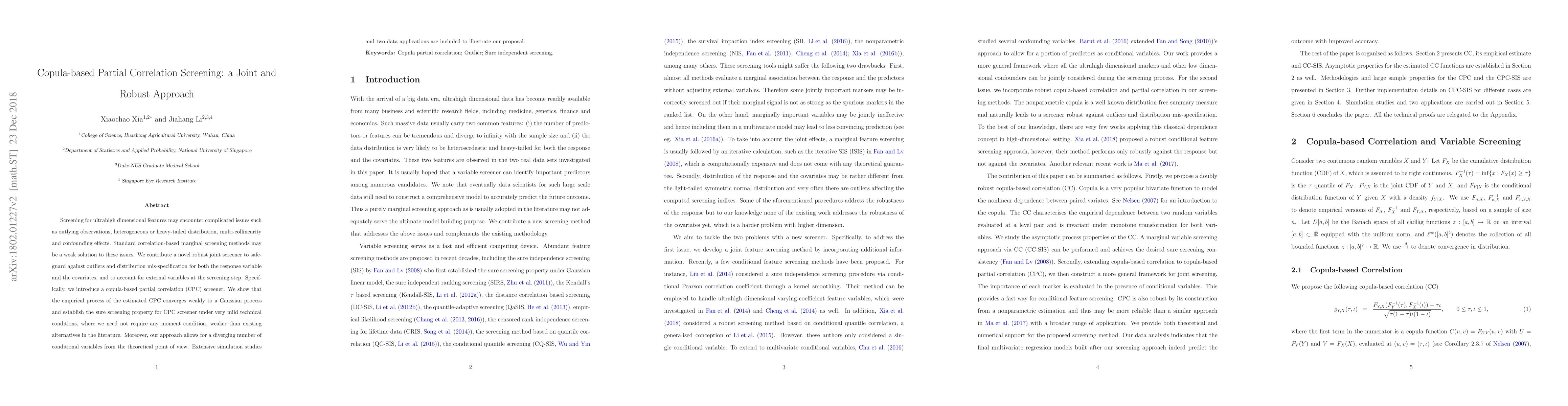 This paper introduces a novel copula-based partial correlation (CPC) screener to robustly identify relevant features in high-dimensional data, addressing issues like outliers and heteroscedasticity. The CPC method ensures convergence to a Gaussian process and guarantees screening effectiveness under minimal conditions, outperforming existing methods.