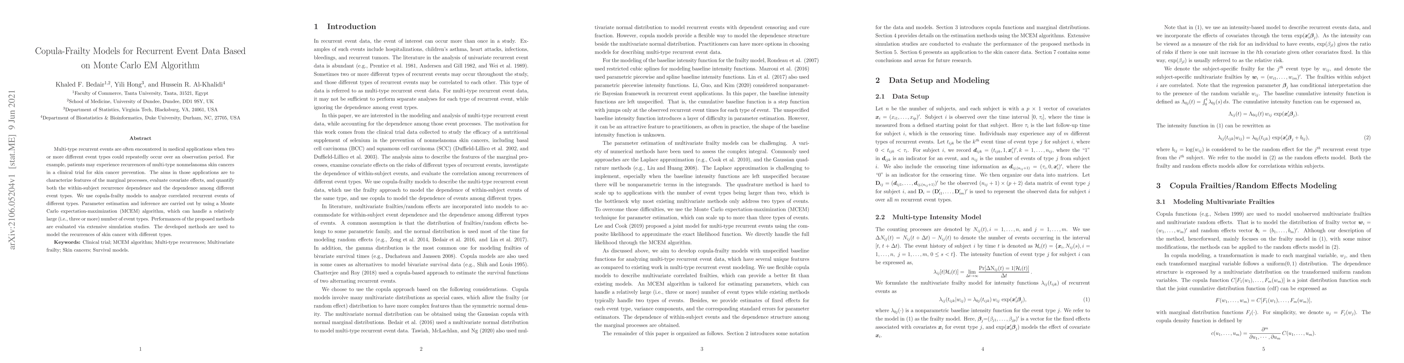 Multi-type recurrent events are often encountered in medical applications when two or more different event types could repeatedly occur over an observation period. For example, patients may experience recurrences of multi-type nonmelanoma skin cancers in a clinical trial for skin cancer prevention. The aims in those applications are to characterize features of the marginal processes, evaluate covariate effects, and quantify both the within-subject recurrence dependence and the dependence among different event types. We use copula-frailty models to analyze correlated recurrent events of different types. Parameter estimation and inference are carried out by using a Monte Carlo expectation-maximization (MCEM) algorithm, which can handle a relatively large (i.e., three or more) number of event types. Performances of the proposed methods are evaluated via extensive simulation studies. The developed methods are used to model the recurrences of skin cancer with different types.