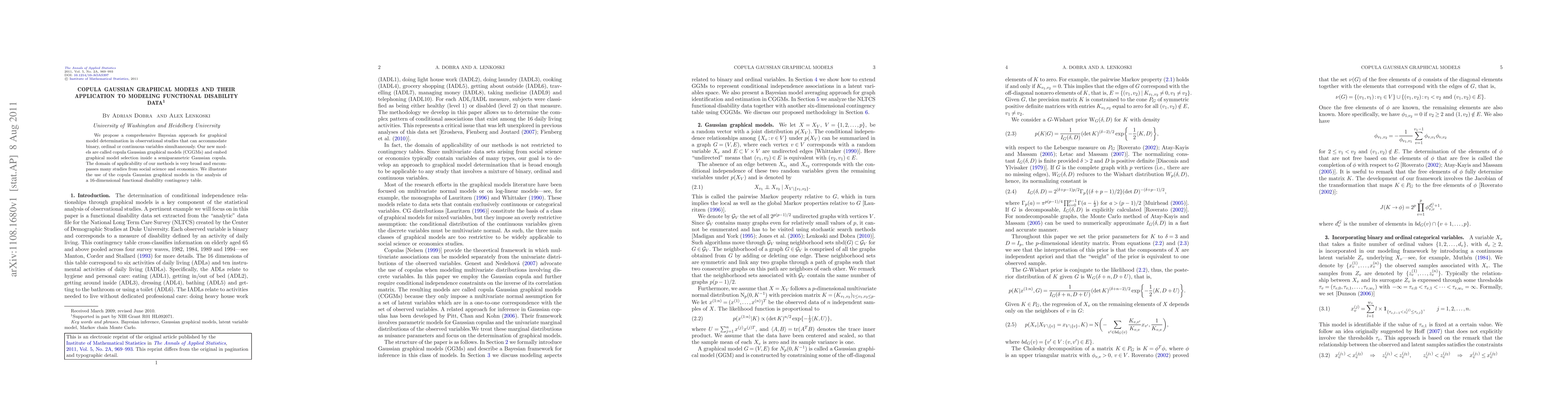This paper introduces copula Gaussian graphical models (CGGMs) for Bayesian graphical model determination, accommodating various variable types. The proposed method is applied to analyze a 16-dimensional functional disability data set, demonstrating its broad applicability in social science and economics.