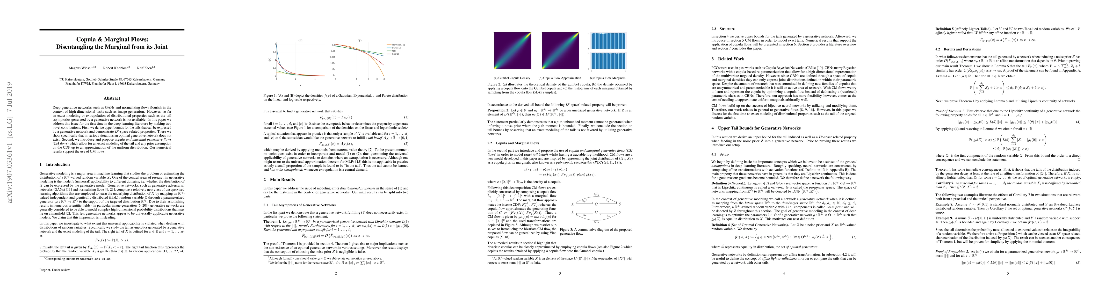 This paper presents copula and marginal flows (CM flows) to address the lack of exact tail modeling in deep generative networks like GANs and normalizing flows. It establishes upper tail bounds and demonstrates non-existence of optimal generative networks in certain situations, supporting the use of CM flows through numerical results.