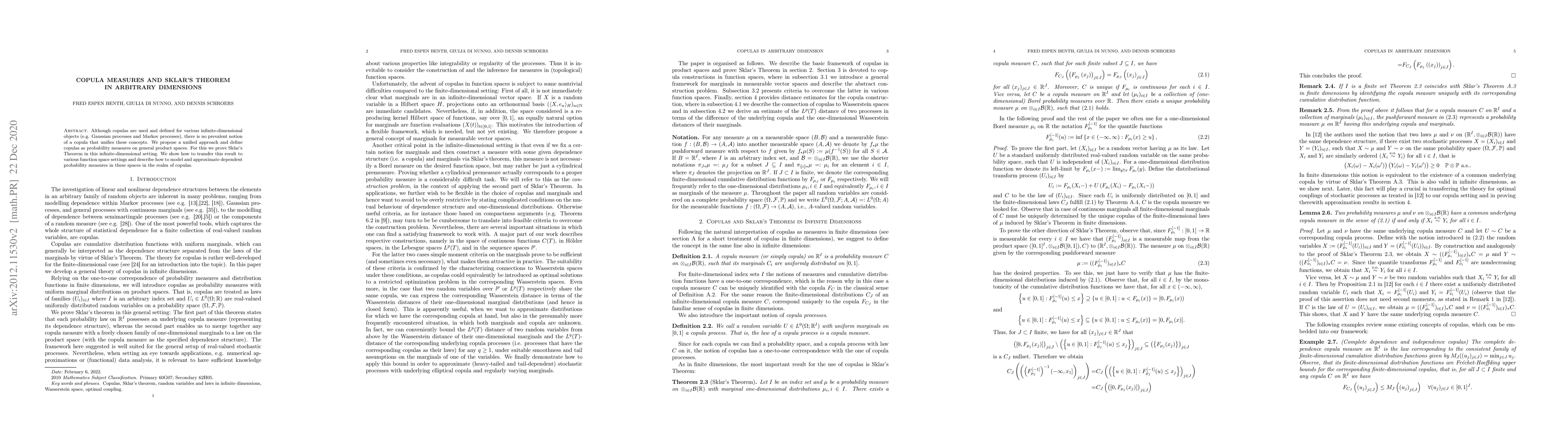 This paper proposes a unified definition of copulas for infinite-dimensional objects, defining them as probability measures on general product spaces and proving Sklar's Theorem in this setting. The authors demonstrate how to apply this approach to various function space settings and discuss modeling and approximating dependent probability measures using copulas.
