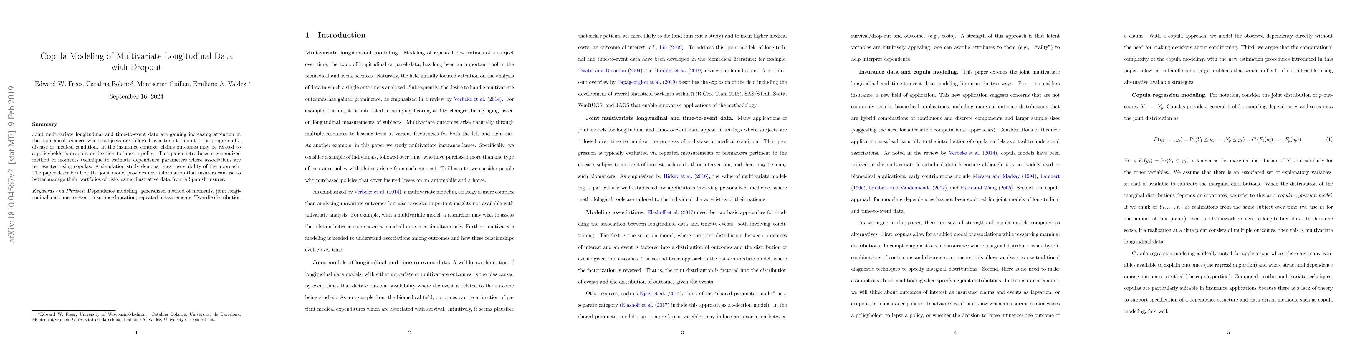 This paper presents a novel method using copula modeling to assess dependence parameters in joint multivariate longitudinal and time-to-event data, applicable in biomedical research and insurance. A simulation study validates the approach, demonstrating its utility for insurers in managing risk portfolios with illustrative data from a Spanish insurer.