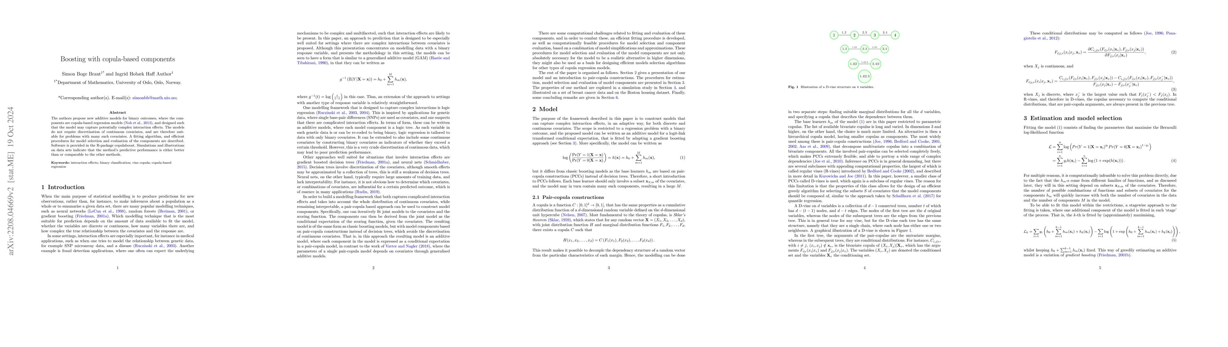 Copulaboost introduces a novel type of generalised additive model based on pair-copula constructions, designed to capture complex interactions without requiring discretisation of continuous covariates. The method, fitted via a gradient boosting algorithm, demonstrates competitive prediction performance compared to alternatives like logic regression and classic boosting models.