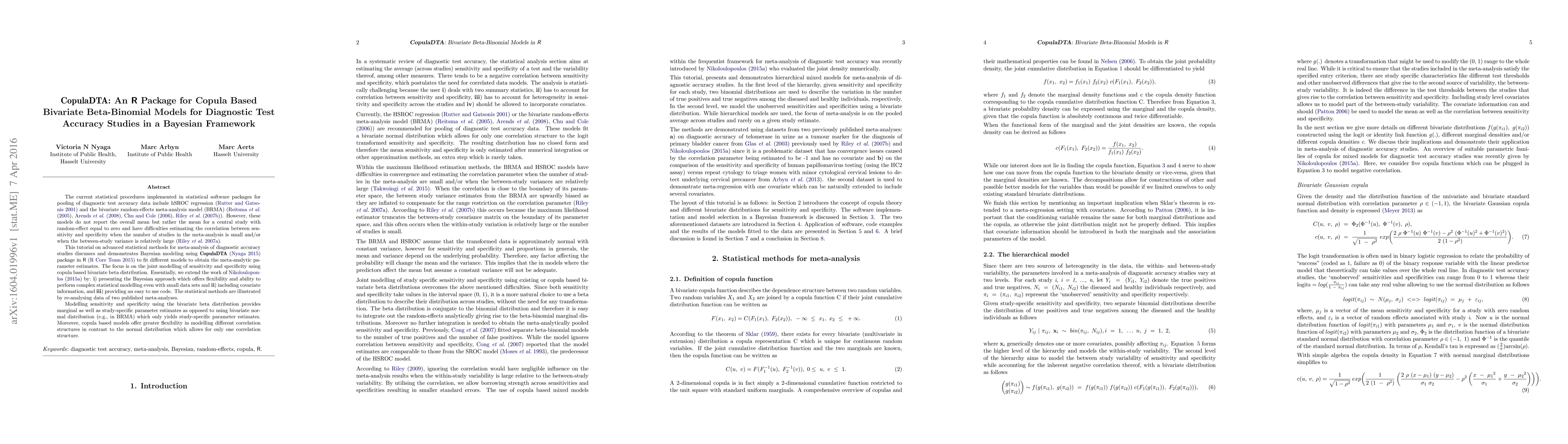 The CopulaDTA R package facilitates Bayesian modeling for diagnostic test accuracy studies by employing copula-based bivariate beta-binomial models, offering improved flexibility and accuracy over traditional methods like BRMA, especially for small datasets and varied study variances. The package extends existing methods by incorporating covariate information and providing user-friendly code for complex statistical modeling.