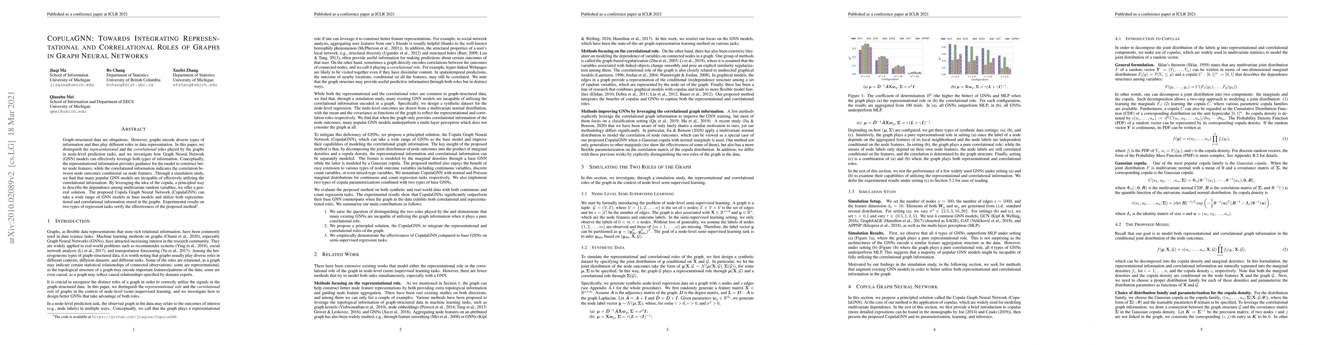 Graph-structured data are ubiquitous. However, graphs encode diverse types of information and thus play different roles in data representation. In this paper, we distinguish the \textit{representational} and the \textit{correlational} roles played by the graphs in node-level prediction tasks, and we investigate how Graph Neural Network (GNN) models can effectively leverage both types of information. Conceptually, the representational information provides guidance for the model to construct better node features; while the correlational information indicates the correlation between node outcomes conditional on node features. Through a simulation study, we find that many popular GNN models are incapable of effectively utilizing the correlational information. By leveraging the idea of the copula, a principled way to describe the dependence among multivariate random variables, we offer a general solution. The proposed Copula Graph Neural Network (CopulaGNN) can take a wide range of GNN models as base models and utilize both representational and correlational information stored in the graphs. Experimental results on two types of regression tasks verify the effectiveness of the proposed method.