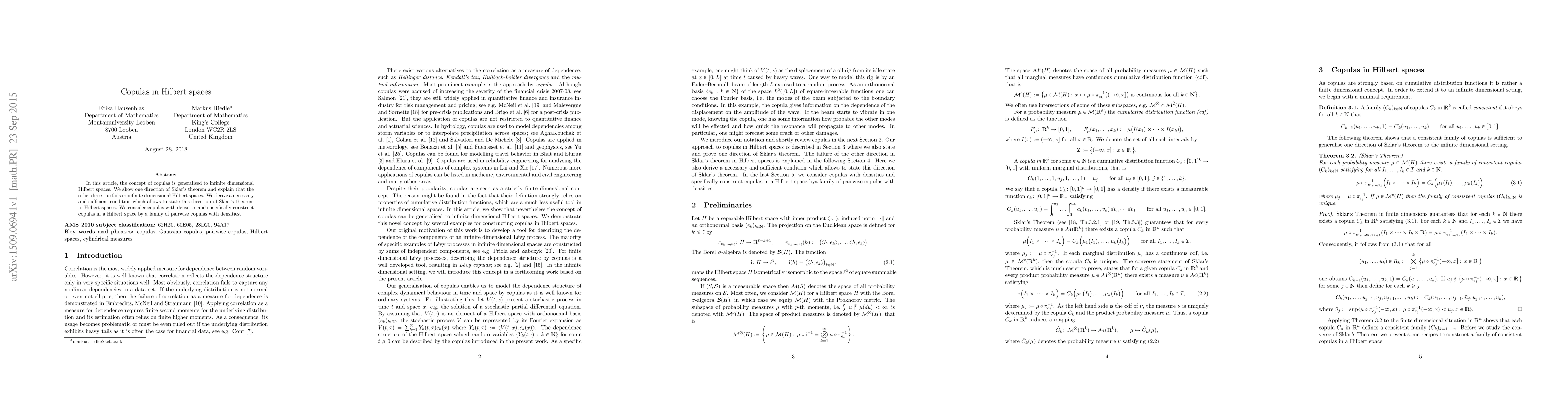 The research generalizes the concept of copulas to infinite-dimensional Hilbert spaces, showing one direction of Sklar's theorem holds while the other fails, and deriving a necessary and sufficient condition for this direction in Hilbert spaces.