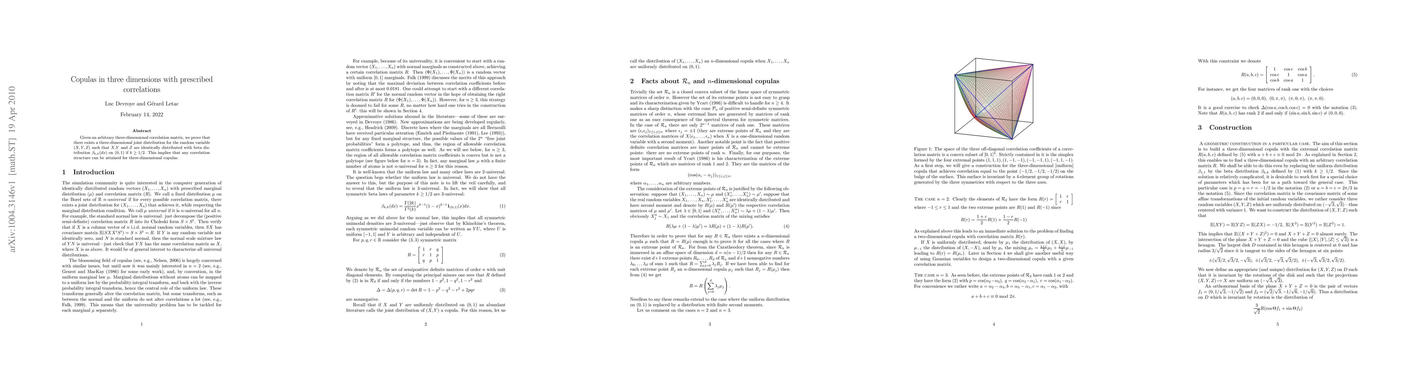 Given an arbitrary three-dimensional correlation matrix, we prove that there exists a three-dimensional joint distribution for the random variable $(X,Y,Z)$ such that $X$,$Y$ and $Z$ are identically distributed with beta distribution $\beta_{k,k}(dx)$ on $(0,1)$ if $k\geq 1/2$. This implies that any correlation structure can be attained for three-dimensional copulas.