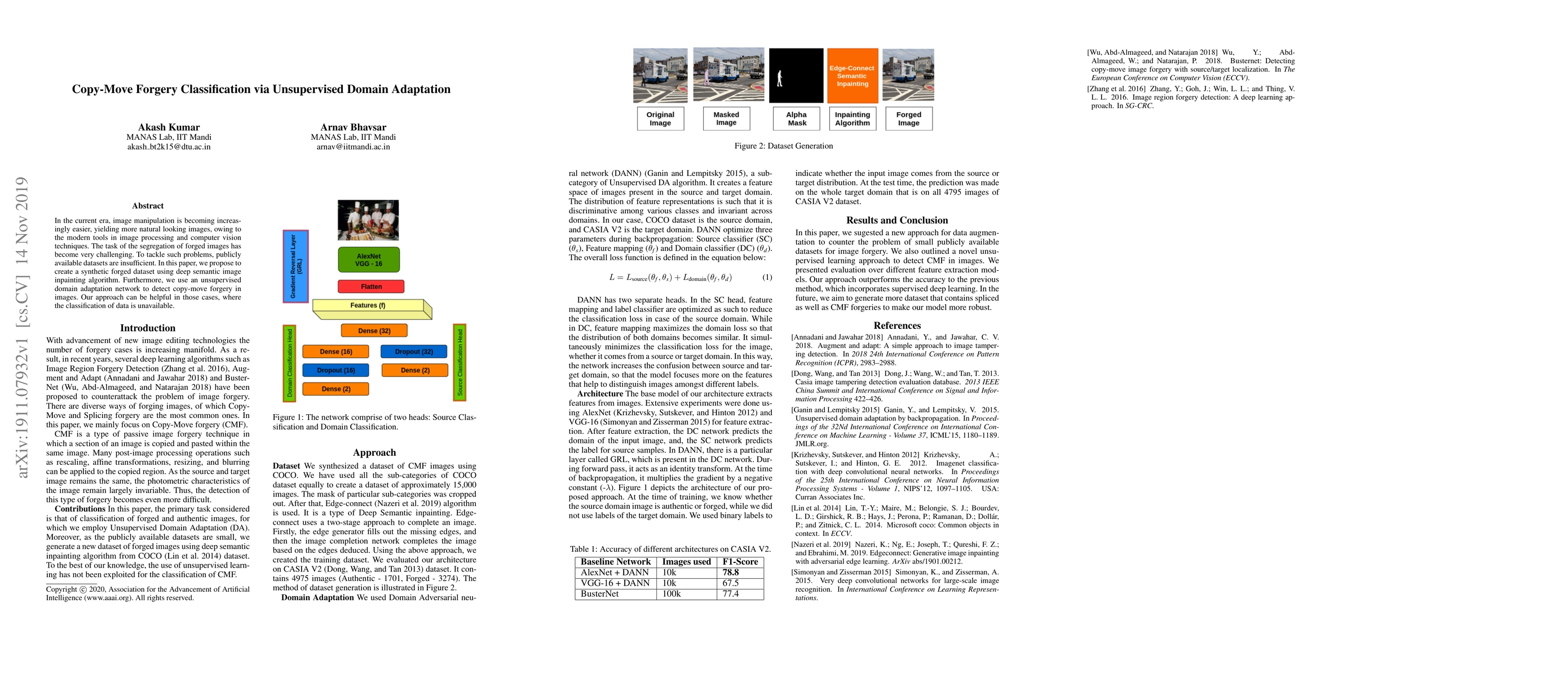 In the current era, image manipulation is becoming increasingly easier, yielding more natural looking images, owing to the modern tools in image processing and computer vision techniques. The task of the segregation of forged images has become very challenging. To tackle such problems, publicly available datasets are insufficient. In this paper, we propose to create a synthetic forged dataset using deep semantic image inpainting algorithm. Furthermore, we use an unsupervised domain adaptation network to detect copy-move forgery in images. Our approach can be helpful in those cases, where the classification of data is unavailable.