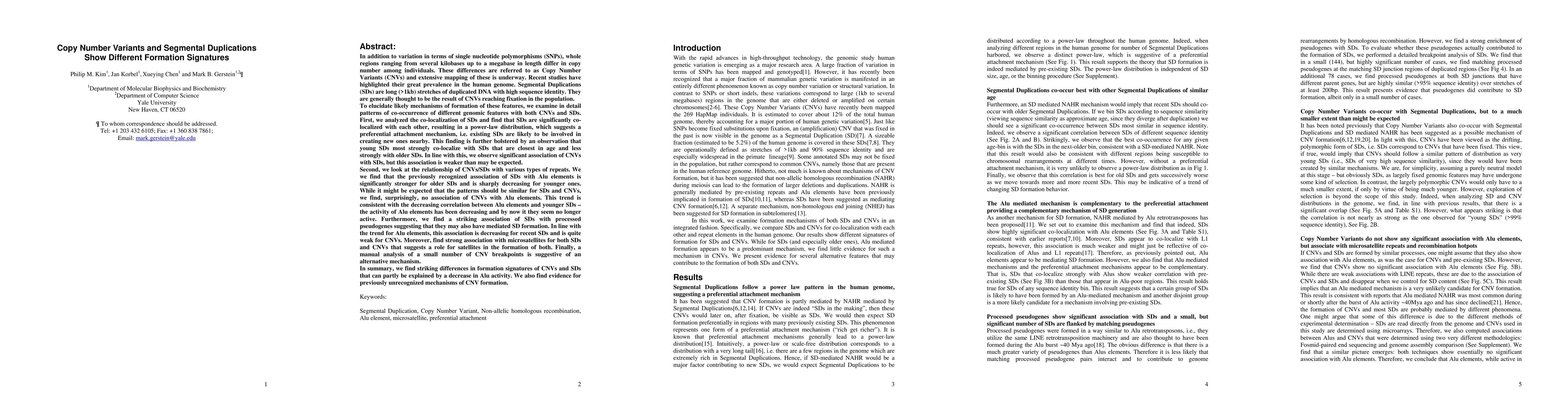 This paper investigates the formation signatures of Copy Number Variants (CNVs) and Segmental Duplications (SDs), revealing distinct mechanisms. SDs show a preferential attachment mechanism and a strong association with processed pseudogenes and microsatellites, while CNVs lack an association with Alu elements, suggesting different formation processes between SDs and CNVs.