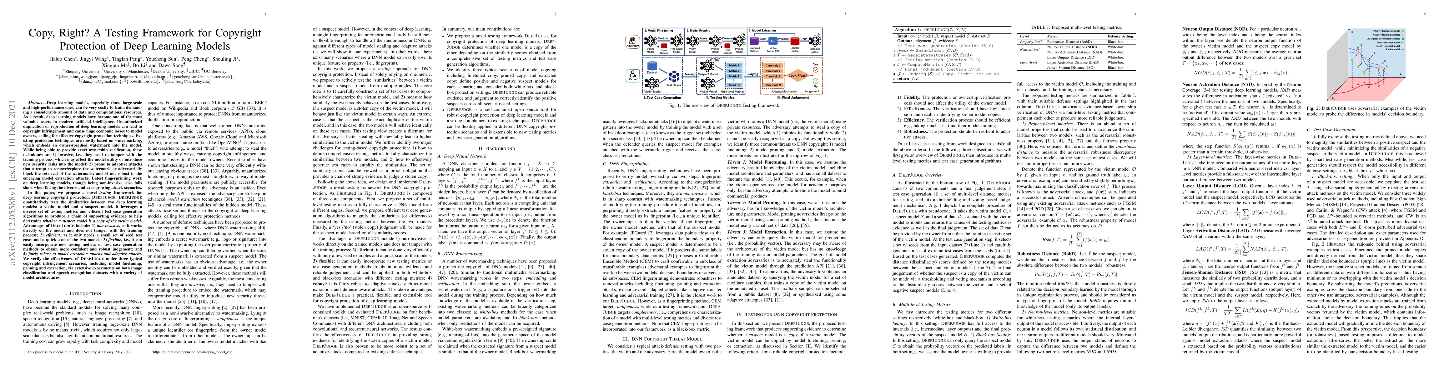 Deep learning (DL) models, especially those large-scale and high-performance ones, can be very costly to train, demanding a great amount of data and computational resources. Unauthorized reproduction of DL models can lead to copyright infringement and cause huge economic losses to model owners. Existing copyright protection techniques are mostly based on watermarking, which embeds an owner-specified watermark into the model. While being able to provide exact ownership verification, these techniques are 1) invasive, as they need to tamper with the training process, which may affect the utility or introduce new security risks; 2) prone to adaptive attacks that attempt to remove the watermark; and 3) not robust to the emerging model extraction attacks. Latest fingerprinting work, though being non-invasive, also falls short when facing the diverse and ever-growing attack scenarios. In this paper, we propose a novel testing framework for DL copyright protection: DEEPJUDGE. DEEPJUDGE quantitatively tests the similarities between two DL models: a victim model and a suspect model. It leverages a diverse set of testing metrics and test case generation methods to produce a chain of supporting evidence to help determine whether a suspect model is a copy of the victim model. Advantages of DEEPJUDGE include: 1) non-invasive, as it works directly on the model and does not tamper with the training process; 2) efficient, as it only needs a small set of test cases and a quick scan of models; 3) flexible, as it can easily incorporate new metrics or generation methods to obtain more confident judgement; and 4) fairly robust to model extraction and adaptive attacks. We verify the effectiveness of DEEPJUDGE under typical copyright infringement scenarios, including model finetuning, pruning and extraction, via extensive experiments on both image and speech datasets with a variety of model architectures.